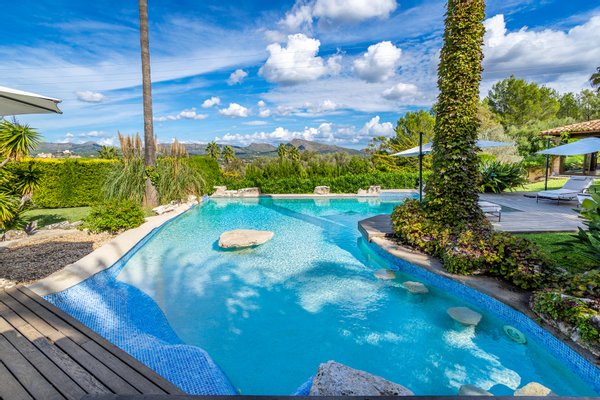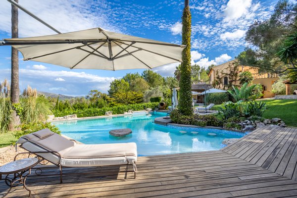 Sowohl vom Haupthaus, als auch vom Gästehaus, hat man Zugang zum weitläufigen, fast 700 m² grossem Poolbereich mit altem Baumbestand, Rasenflächen, Sonnenterrassen und 85 m2 grossem Pool. Eine überdachte Poolbar mit Essplatz und BBQ lädt zum geselligen Beisammensein ein.