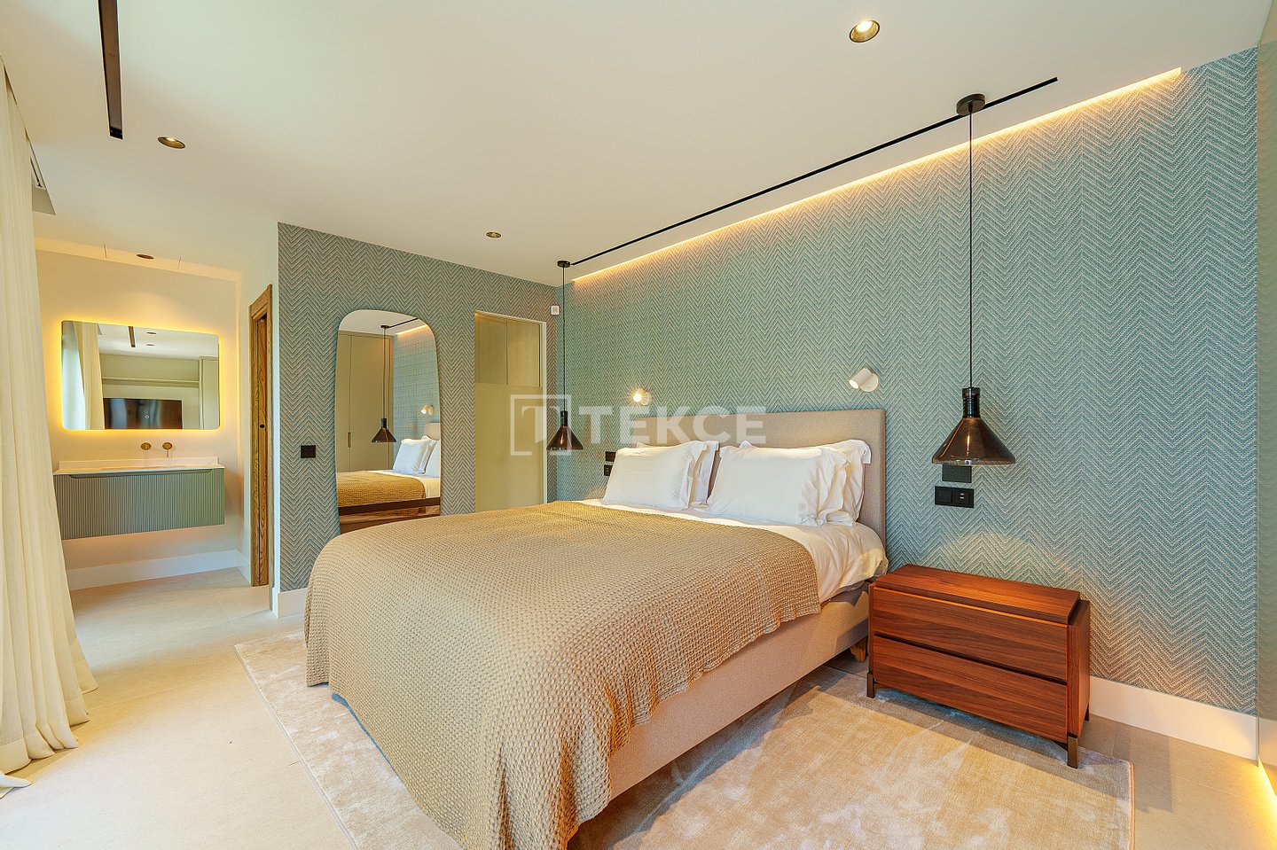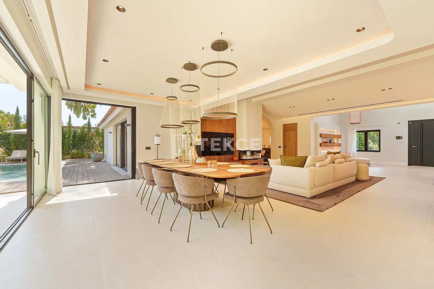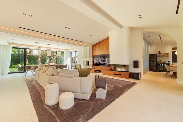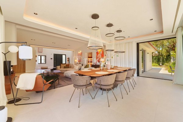 Das Innere dieser Villa mit 5 Schlafzimmern zeichnet sich durch eine helle und geräumige Aufteilung mit einem modernen, minimalistischen Design aus, das warme, natürliche Farbtöne aufgreift. Raumhohe Fenster lassen reichlich Tageslicht in die offenen Wohnbereiche und betonen die klaren Linien und die hochwertige Ausstattung. Das Design verbindet Komfort und Eleganz nahtlos miteinander und schafft eine einladende Atmosphäre, die sowohl zum Entspannen als auch zur Unterhaltung ideal ist.