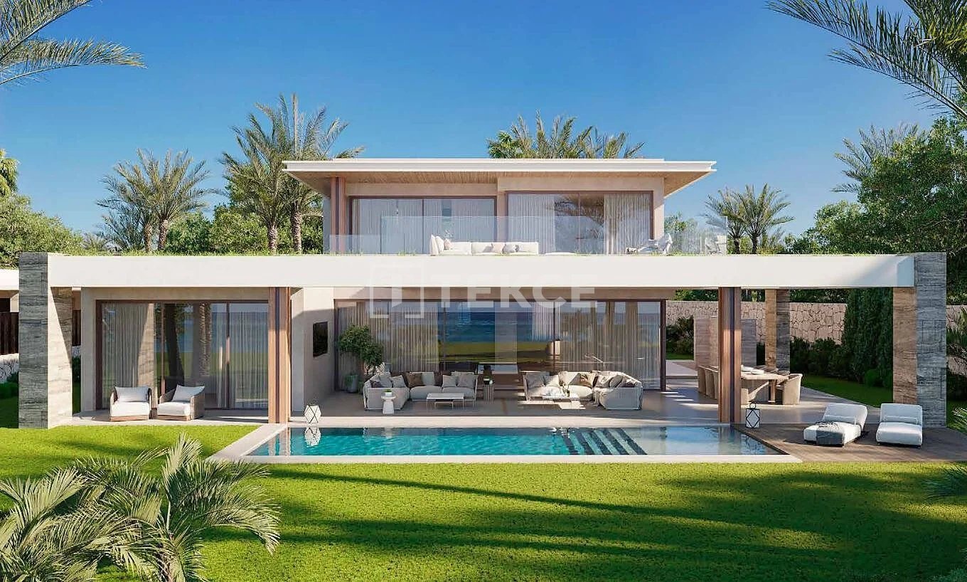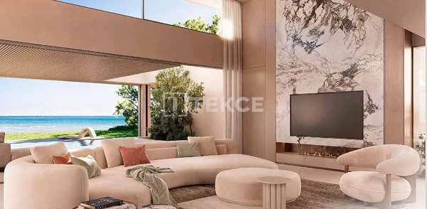 Im Inneren sind die Villen auf drei Ebenen angeordnet, die durch einen Aufzug miteinander verbunden sind, wodurch Raum, Funktionalität und Aussicht optimiert werden. Großzügige Glasfronten durchfluten die Innenräume mit Tageslicht, insbesondere das beeindruckende Wohnzimmer mit doppelter Deckenhöhe, und verstärken so die Verbindung zur umgebenden Landschaft. Die offenen Wohnbereiche gehen nahtlos in den Außenbereich über, während die oberen Etagen mit eleganten Suiten und Terrassen mit Meerblick Privatsphäre bieten. Die untere Etage ist dem Wohlbefinden gewidmet und verfügt über einen Innenpool, ein Spa, einen Fitnessraum, einen Kinoraum und spezielle Entspannungsbereiche, wodurch ein ausgewogenes Verhältnis zwischen Alltag und luxuriösem Rückzugsort geschaffen wird.
