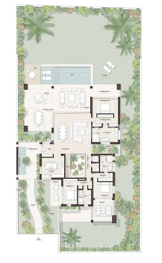 Die Außenbereiche sind als natürliche Erweiterung der Strandlage konzipiert und bieten eine nahtlose Verbindung von Privatsphäre und Freizeit. Große Terrassen öffnen sich zu privaten Gärten und Schwimmbädern und schaffen eine ruhige Außenumgebung, die ideal zum Entspannen oder zur Unterhaltung ist. Trotz der Unabhängigkeit jeder Villa profitieren die Bewohner auch vom Zugang zu gemeinsamen Wellnesseinrichtungen der Extraklasse, darunter ein Gemeinschafts-Spa, was das Gefühl von Exklusivität und Komfort innerhalb der Anlage noch verstärkt.