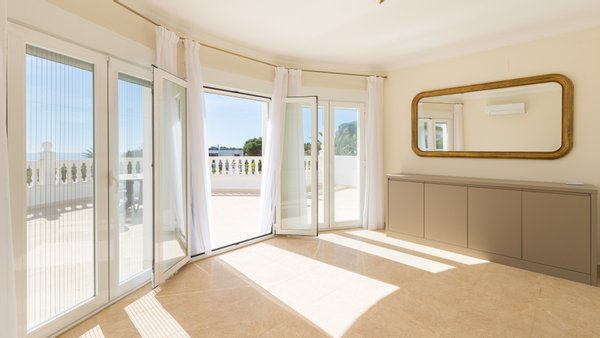 Im ersten Stock befinden sich zwei Doppelschlafzimmer, jeweils mit eigenem Badezimmer mit Badewanne und Dusche, und ein zweites Wohnzimmer. Alle Zimmer im ersten Stock haben direkten Zugang zu einer großen Terrasse mit Meerblick.