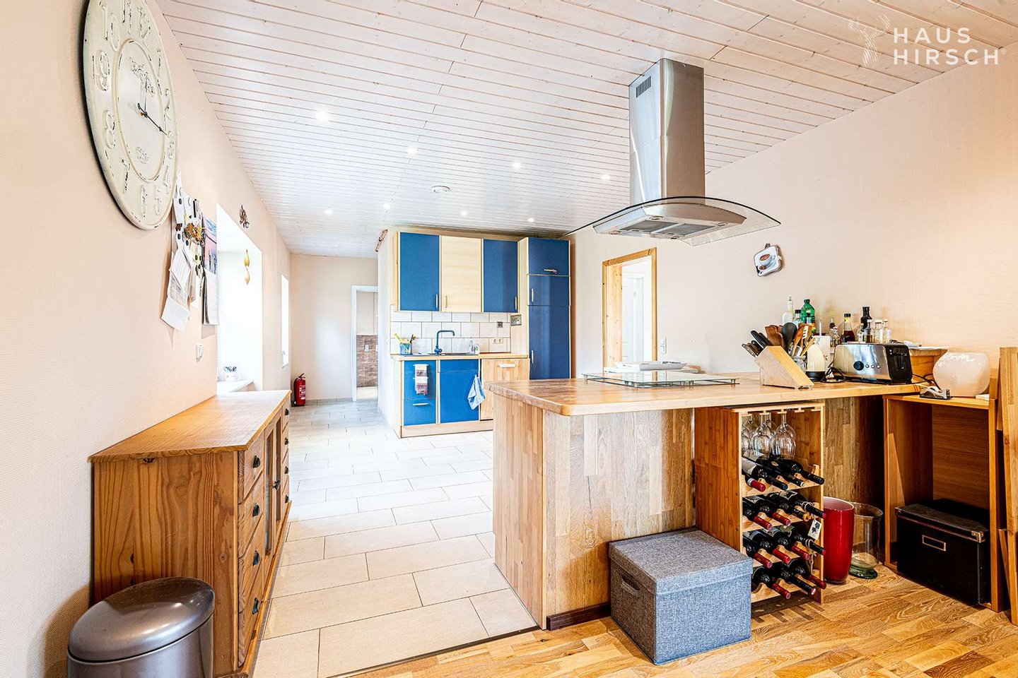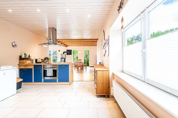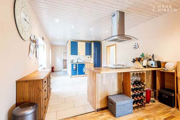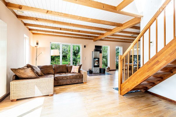 Denn durch die offene Gestaltung der Küche, des Ess- und Wohnzimmers hat man das Gefühl, immer dabei zu sein. Das Vollholzparkett sorgt dabei in den Räumen für ein angenehmes Wohnklima.