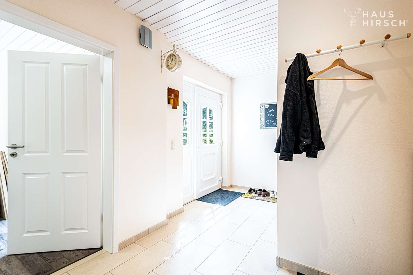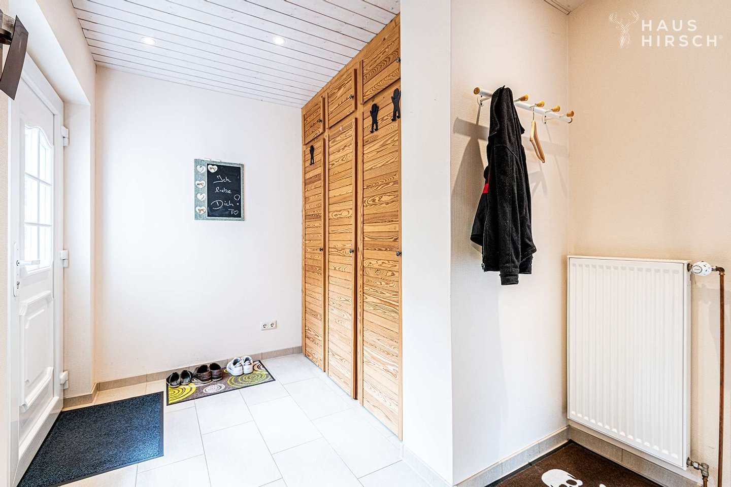 Durch die Hauseingangstüre gelangen Sie in den hellen Hausflur und können dann direkt ins separat anliegende Büro, wenn es nochmal schnell an den Schreibtisch soll.