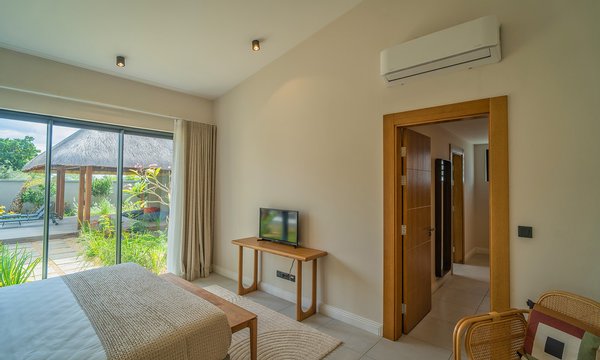 Crafted to premium standards, the villa showcases high-quality materials and meticulous attention to detail. A solid wood entrance door sets the tone for understated elegance, while interior doors combine wood and stainless steel accents for a contemporary touch. The wood-clad façade blends harmoniously with the natural environment. Inside, smooth painted walls and ceilings complement large-format porcelain stoneware flooring throughout the main living spaces, while parquet flooring in the master bedrooms adds warmth and sophistication. Air conditioning in every bedroom and ceiling fans in living areas ensure optimal comfort in all seasons.