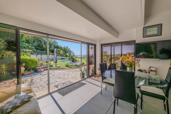 Auf einer Ebene öffnen sich die sonnenverwöhnten Empfangsbereiche harmonisch auf eine große, nach Süd-Südwesten ausgerichtete Terrasse, die zur Betrachtung des Horizonts einlädt. Die voll ausgestattete Küche mit einer professionellen Hinterküche erweitert den Wohnkomfort. Die helle Veranda ist eine echte Entspannungslounge mit Blick auf das Meer. Der Schlafbereich bietet ein Hauptschlafzimmer mit Badezimmer sowie begehbare Dusche und Umkleideraum, drei weitere elegante Schlafzimmer und zwei Duschräume.