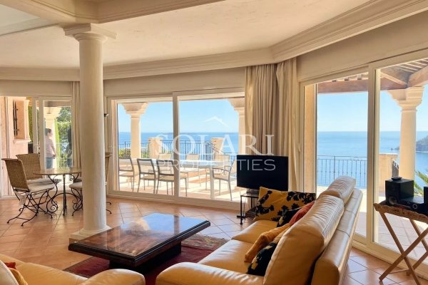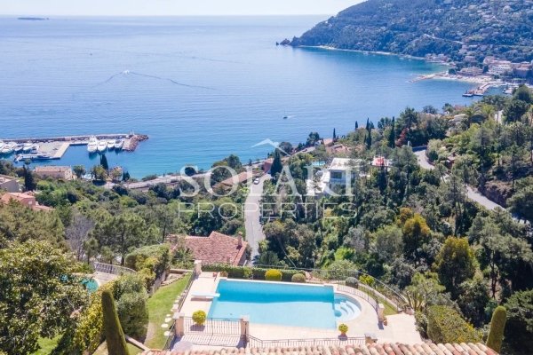 In a renowned, secure estate in Théoule-sur-Mer, just minutes from the village, ports, beaches, and restaurants, this exceptional villa boasts breathtaking sea views over the Bay of Cannes.