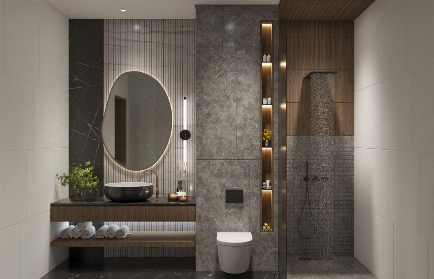 → Premium-Verkleidung — Marmorböden, dunkle Einbauten, Designer-Badezimmer