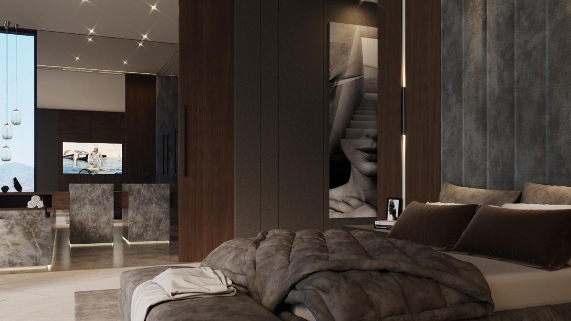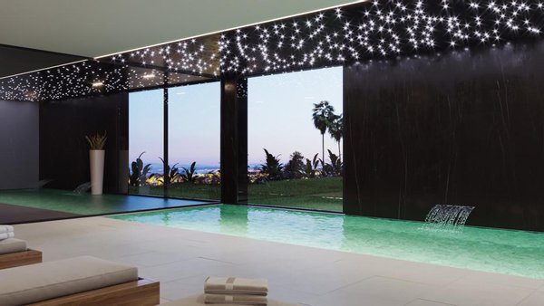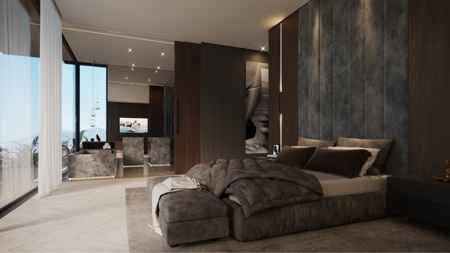 Im Inneren werden die Räume durch bodentiefe Fenster mit natürlichem Licht durchflutet. Die Villa verfügt außerdem über ein Hallenbad, ein privates Fitnessstudio und ein separates Büro, das Luxus und Funktionalität vereint. Die Hauptsuite öffnet sich direkt auf die Terrasse und verfügt über einen Ankleidebereich sowie ein luxuriöses Badezimmer.