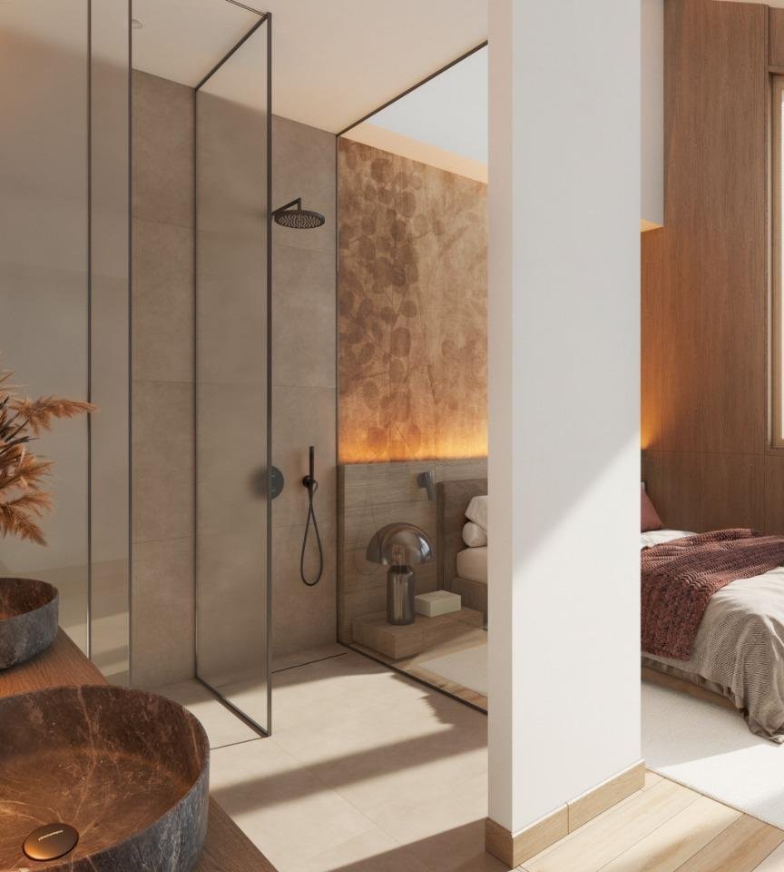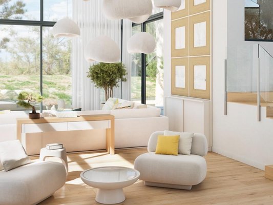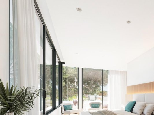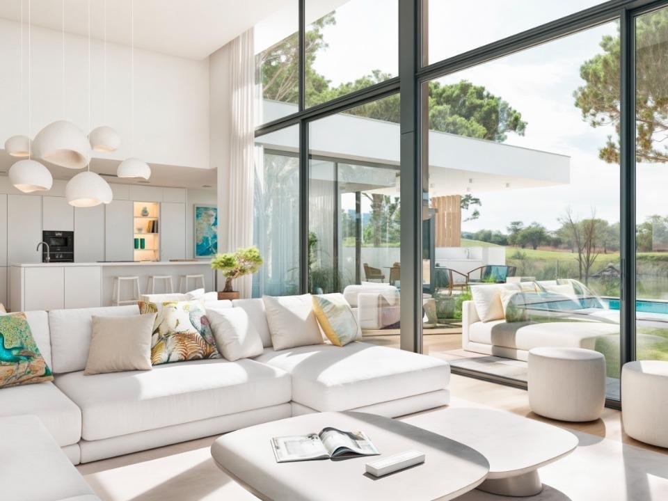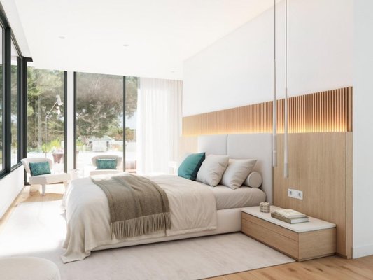Das zeitgenössische Design der Villa umfasst offene Wohnbereiche mit hohen Decken, raumhohen Fenstern und modernen Oberflächen, die die Innenräume mit natürlichem Licht durchfluten. Die Master-Suite ist ein wahres Refugium, ausgestattet mit einer freistehenden Badewanne vor einer Panoramafensterfront. Alle drei Schlafzimmer verfügen über ein eigenes Bad, ergänzt durch vier luxuriöse Badezimmer und ein stilvolles Gäste-WC.