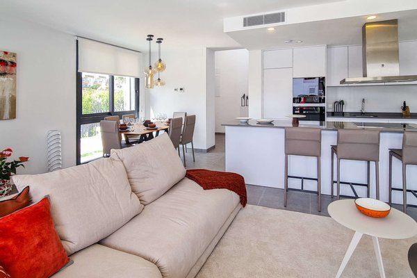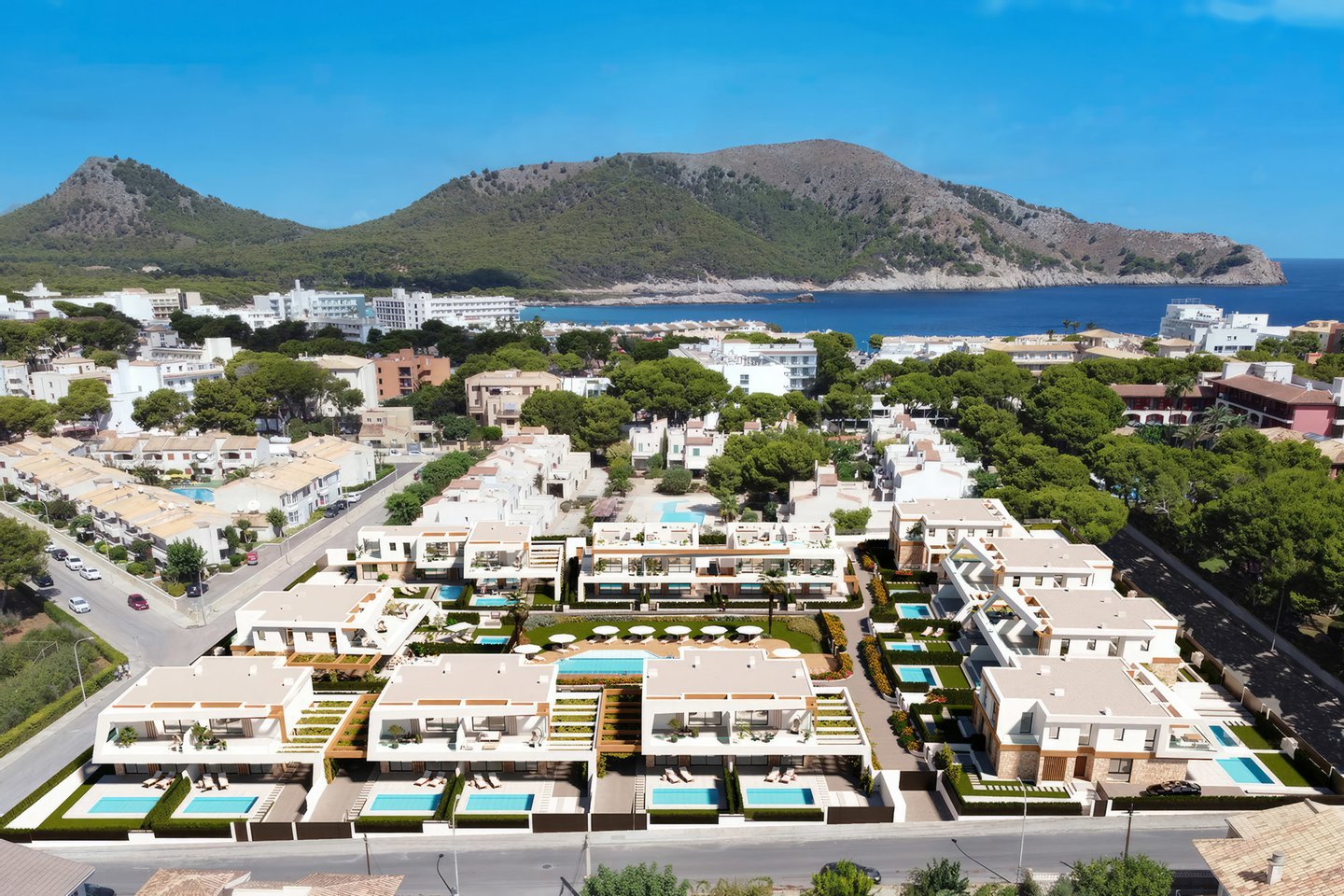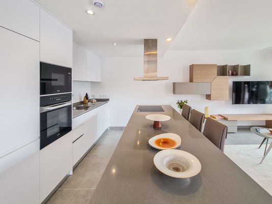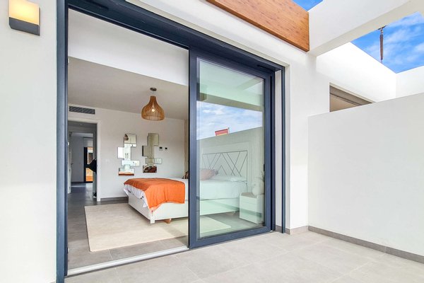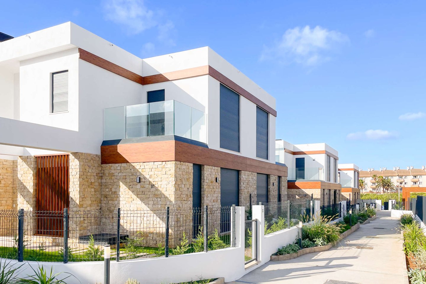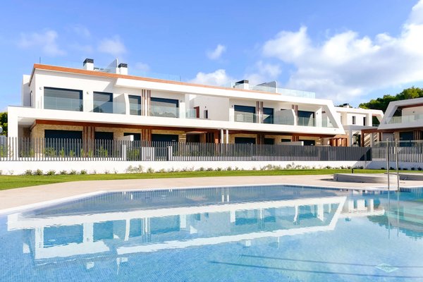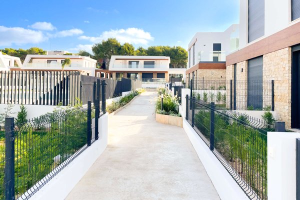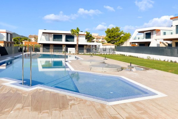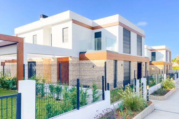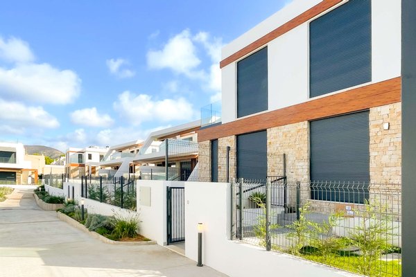 Die kleine, ruhige Wohnanlage befindet sich nur wenige Gehminuten vom Meer entfernt und umfasst 8 moderne Apartments sowie 18 Villen. Die Doppelhaushälften haben eine Wohnfläche von ca. 168m² bis ca. 217m² und beeindrucken mit hellen, offenen Wohn- und Essbereichen samt moderner Küche und direktem Zugang zur Terrasse. Das Erdgeschoss bietet zu einem Schlafzimmer mit Ankleide, zudem einen praktischen Hauswirtschafts- und Abstellraum mit ausreichend Stauraum. Im Obergeschoss erwarten Sie 2 Schlafzimmer und 2 Balkone. Je nach Objekt stehen Ihnen 3 oder 4 Badezimmer zur Verfügung. Fußbodenheizung und integrierte Klimaanlage sorgen zu jeder Jahreszeit für ein angenehmes Raumklima.