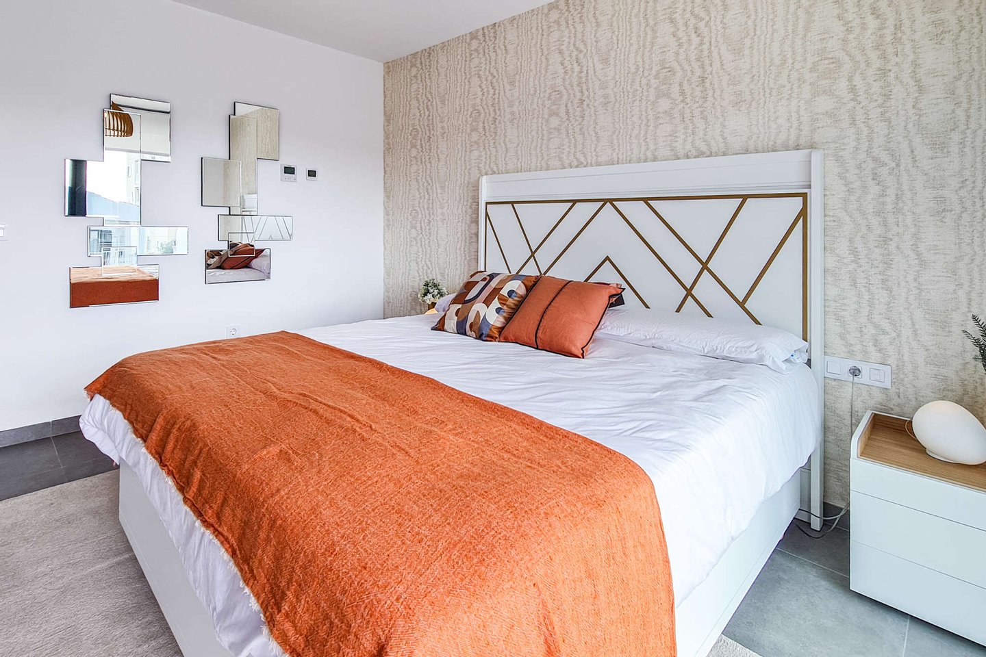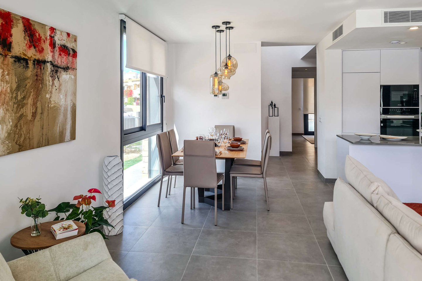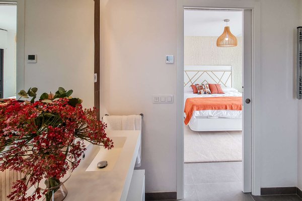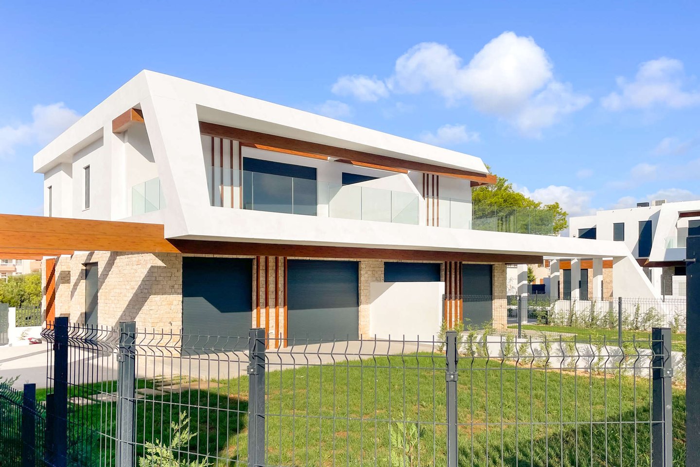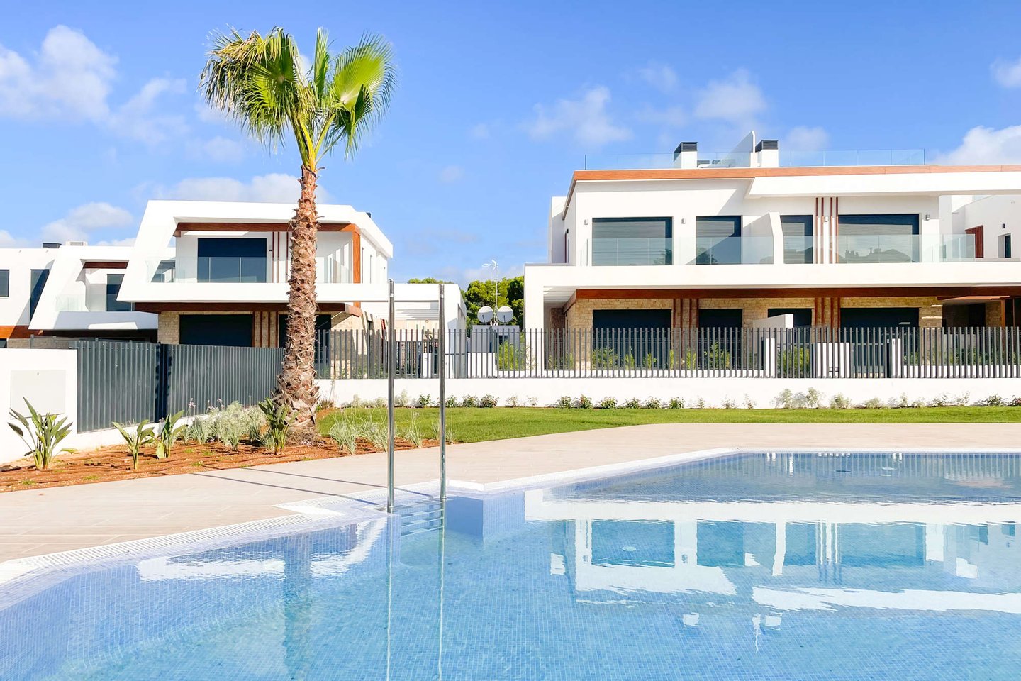 Die kleine, ruhige Wohnanlage befindet sich nur wenige Gehminuten vom Meer entfernt und umfasst 8 moderne Apartments sowie 18 Villen. Die Doppelhaushälften haben eine Wohnfläche von ca. 168m² bis ca. 217m² und beeindrucken mit hellen, offenen Wohn- und Essbereichen samt moderner Küche und direktem Zugang zur Terrasse. Das Erdgeschoss bietet zu einem Schlafzimmer mit Ankleide, zudem einen praktischen Hauswirtschafts- und Abstellraum mit ausreichend Stauraum. Im Obergeschoss erwarten Sie 2 Schlafzimmer und 2 Balkone. Je nach Objekt stehen Ihnen 3 oder 4 Badezimmer zur Verfügung. Fußbodenheizung und integrierte Klimaanlage sorgen zu jeder Jahreszeit für ein angenehmes Raumklima.