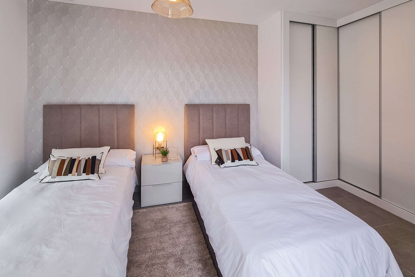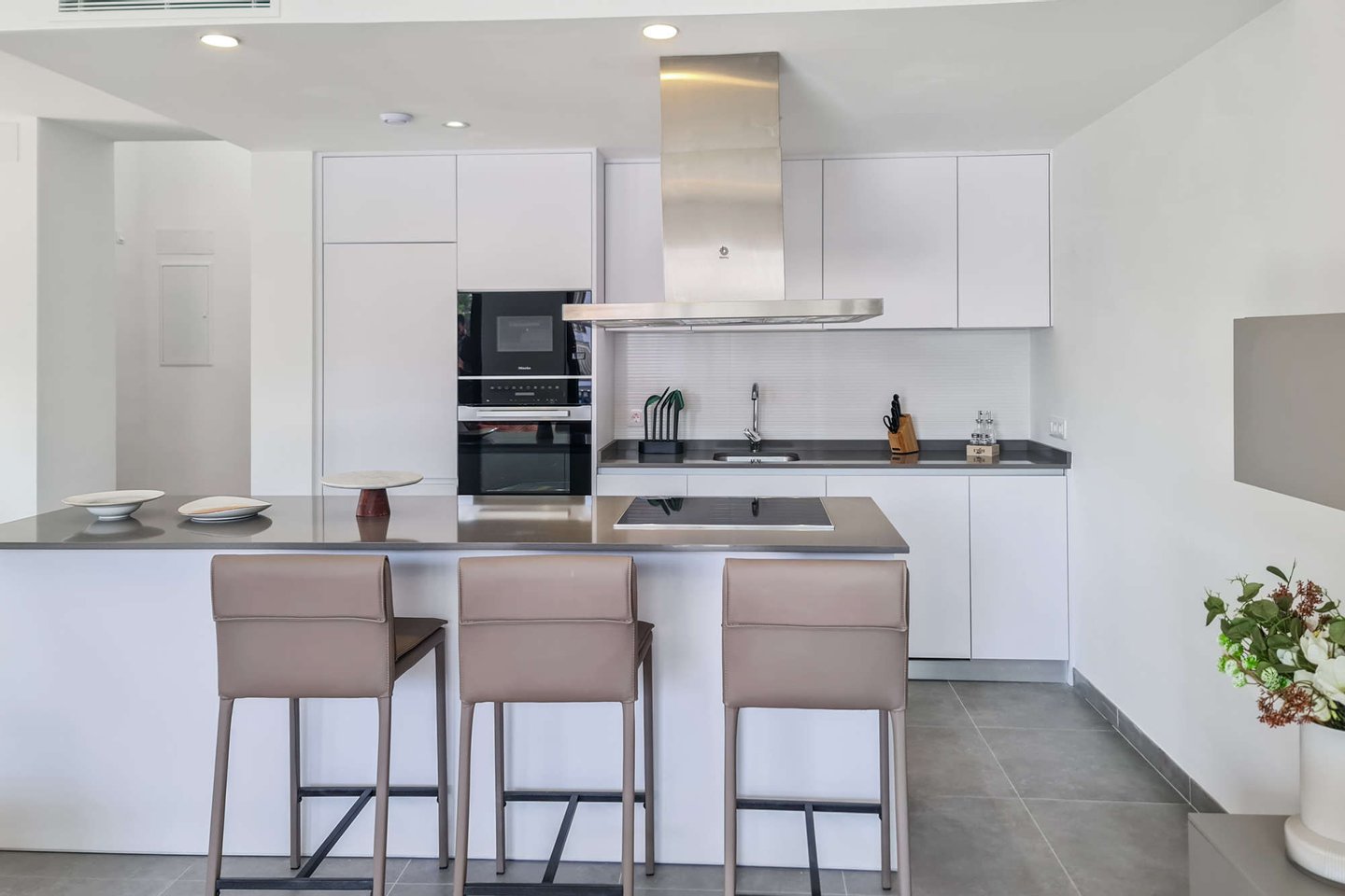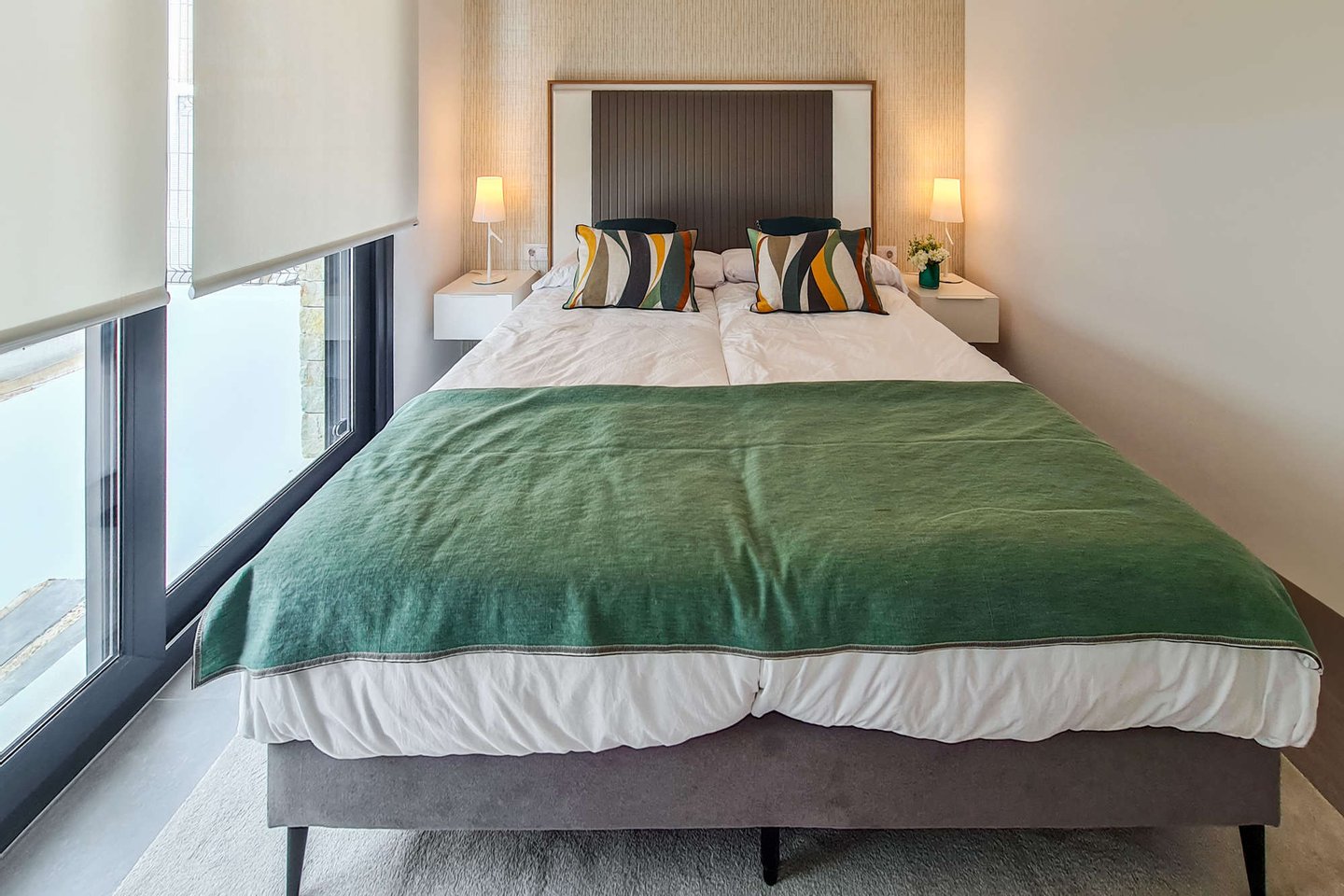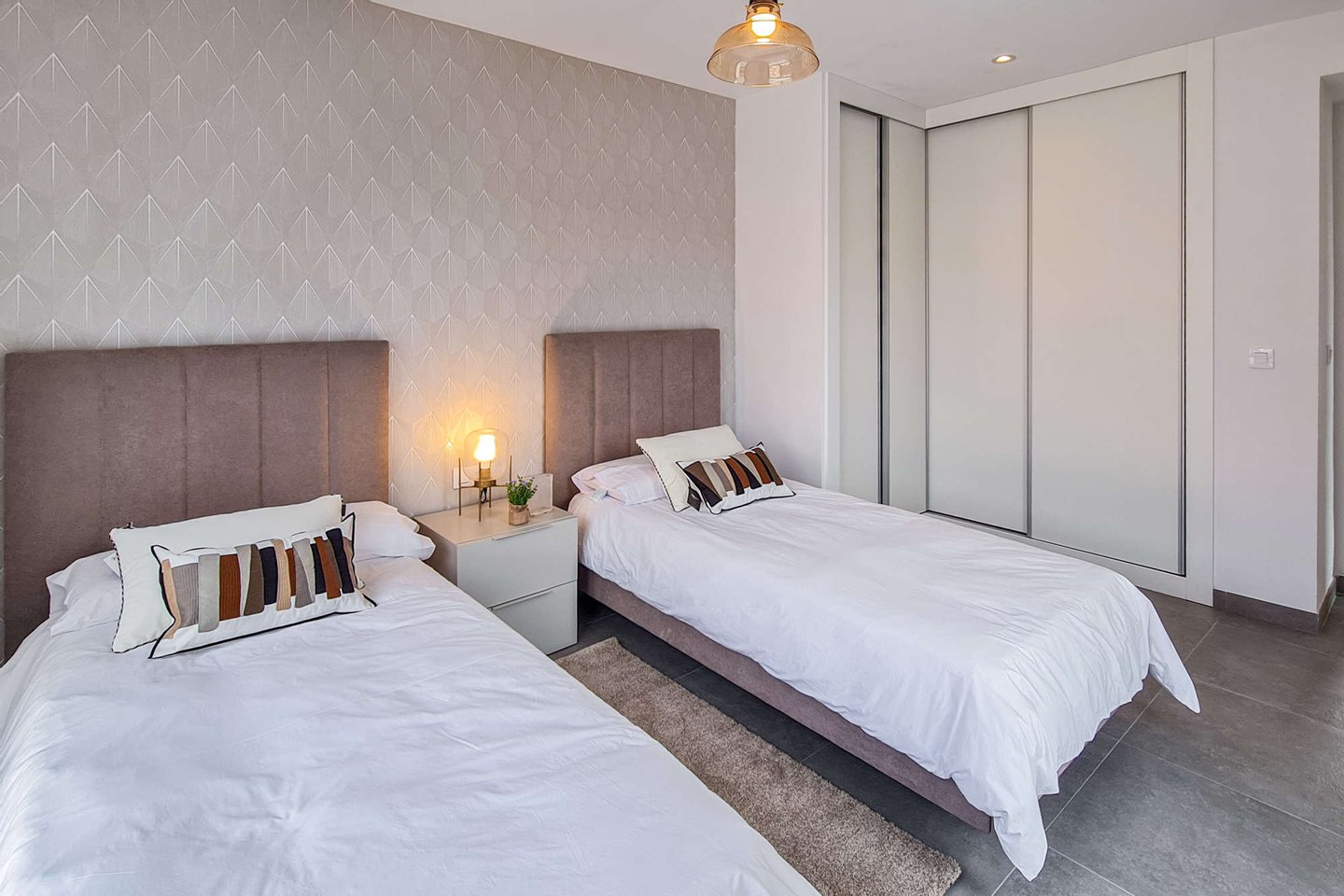 Die kleine, ruhige Wohnanlage befindet sich nur wenige Gehminuten vom Meer entfernt und umfasst 8 moderne Apartments sowie 18 Villen. Die Doppelhaushälften haben eine Wohnfläche von ca. 168m² bis ca. 217m² und beeindrucken mit hellen, offenen Wohn- und Essbereichen samt moderner Küche und direktem Zugang zur Terrasse. Das Erdgeschoss bietet zu einem Schlafzimmer mit Ankleide, zudem einen praktischen Hauswirtschafts- und Abstellraum mit ausreichend Stauraum. Im Obergeschoss erwarten Sie 2 Schlafzimmer und 2 Balkone. Je nach Objekt stehen Ihnen 3 oder 4 Badezimmer zur Verfügung. Fußbodenheizung und integrierte Klimaanlage sorgen zu jeder Jahreszeit für ein angenehmes Raumklima.