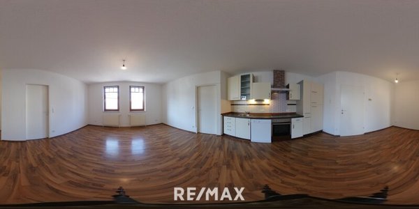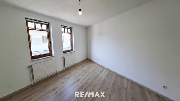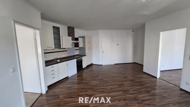 Beim Betreten der Wohnung gelangt man in einen Vorraum, welcher als Garderobe genutzt werden kann. Auf der linken Seite befindet sich ein separates WC. Rechts vom Vorraum liegt das Badezimmer, das mit einer Badewanne ausgestattet ist. Direkt anschließend an das Badezimmer befindet sich ein praktischer Schrankraum oder Abstellraum. Vom Vorraum aus geradeaus gelangt man in den Wohnbereich, der durch zwei Fenster besonders hell ist. Die offene Küche ist mit einer Einbauküche ausgestattet und fügt sich harmonisch in den Wohnraum ein. Vom Wohnbereich aus erreicht man zwei weitere Zimmer, die jeweils ebenfalls über zwei Fenster verfügen und sich flexibel als Schlafzimmer, Kinderzimmer, Büro oder Gästezimmer nutzen lassen. Abgesehen von der Küche und dem Badezimmer sind die Räume unmöbliert und bieten somit vielfältige Gestaltungsmöglichkeiten.