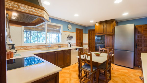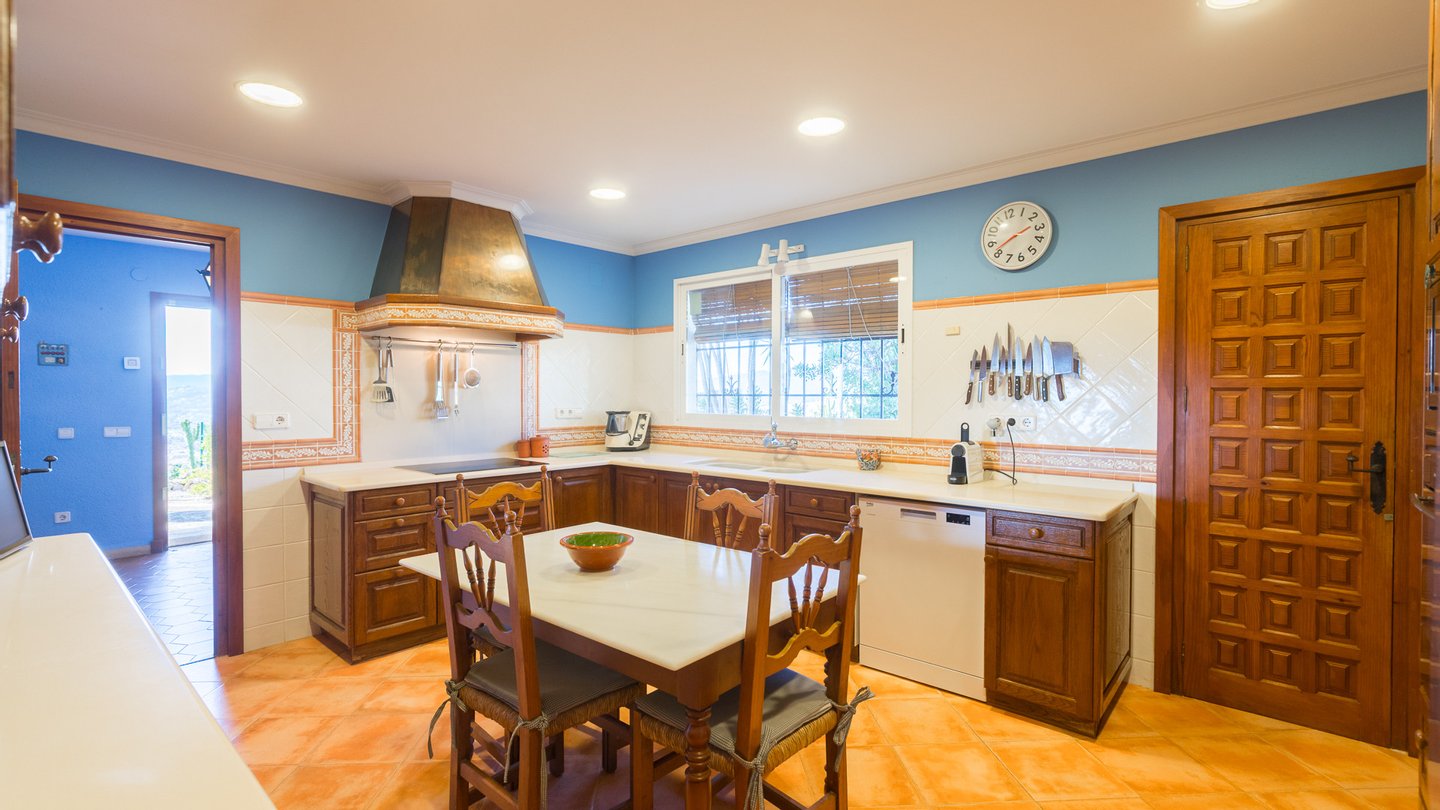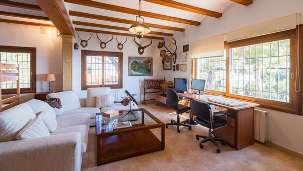 Das Innere der Villa besteht aus drei Schlafzimmern mit Einbauschränken und zwei Badezimmern, von denen eines en suite ist, was Komfort und Privatsphäre fördert. Außerdem verfügt sie über ein Wohnzimmer mit Kamin, Zentralheizung und viel Tageslicht dank der großen Fenster. Im Obergeschoss befindet sich ein Mehrzweckraum, von dem aus man einen herrlichen Blick auf das Mittelmeer genießen kann. Es gibt einen Hauswirtschaftsraum und eine praktische private Garage. Für zusätzliche Sicherheit ist die Villa mit einer Alarmanlage ausgestattet.