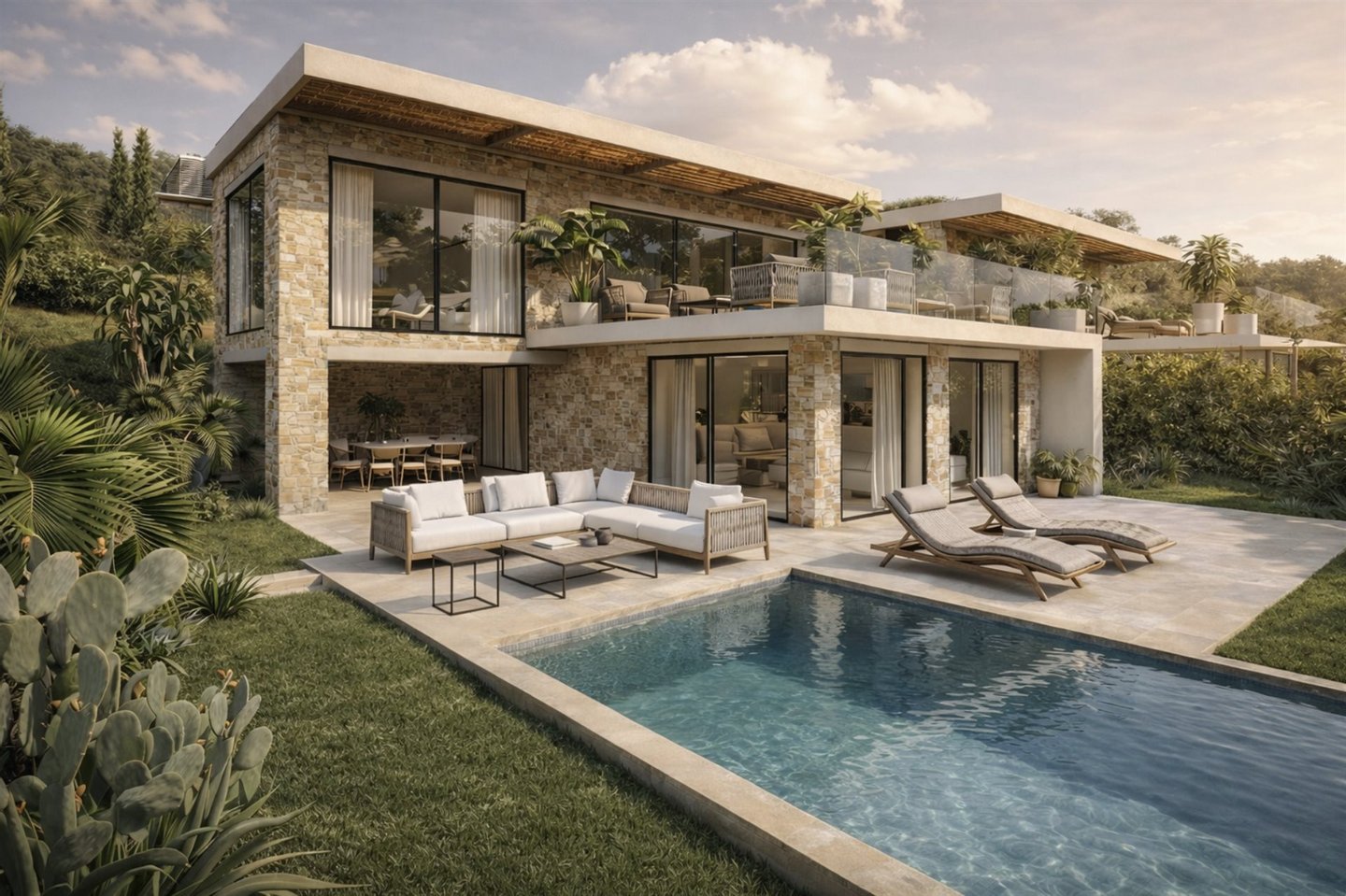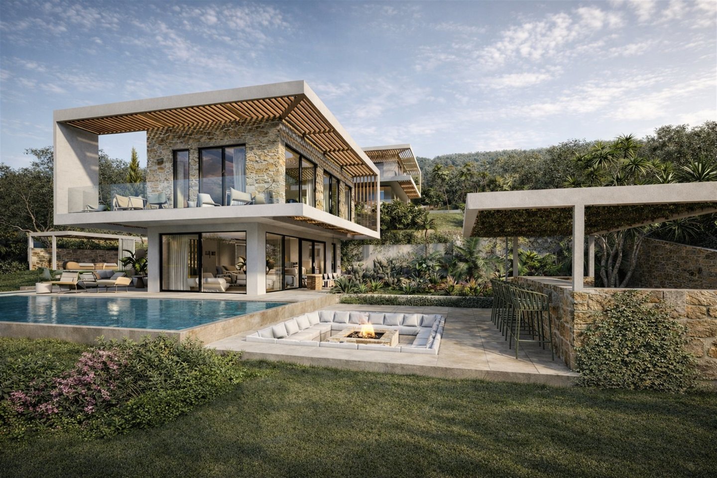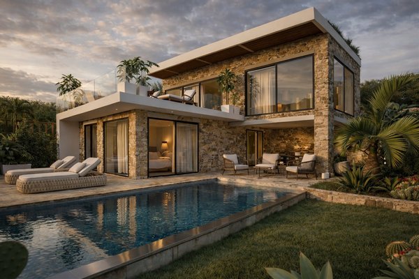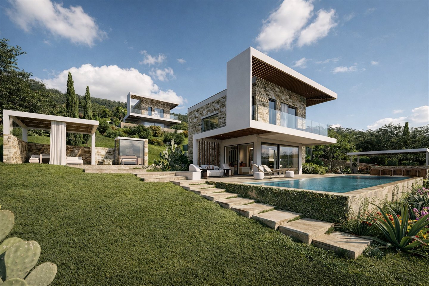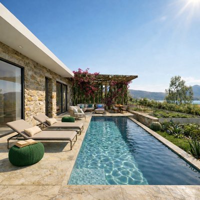 Marevia Two ist eine beeindruckende dreistöckige Villa in Yalova, einem der beliebtesten Resorts an der Westküste Messinias, erbaut in der bezaubernden Navarinobucht nahe Piräus (Pylos). Die Gegend ist berühmt für ihre authentische mediterrane Atmosphäre und Ruhe, mit türkisfarbenem Wasser, Sandstränden und Dünenlandschaften, die eine unvergessliche Landschaft schaffen. Das milde Klima reicht bis Dezember, was sie das ganze Jahr über ideal zum Aufenthalt macht, während der Flughafen Kalamata weniger als vierzig Minuten entfernt ist und leichten Zugang zu dieser hervorragenden Lage bietet. Die Villa mit einer Gesamtfläche von 184 m² auf einem 386 m² großen Grundstück verbindet traditionelle mediterrane Architektur harmonisch mit einer modernen, eleganten Ästhetik. Die Außenwände aus Naturstein, frei in einer wilden Anordnung gelegt, verleihen dem Anwesen einen einzigartigen Charakter, der an die traditionelle griechische Architektur erinnert, dabei jedoch einen absolut zeitgemäßen und eleganten Stil beibehält. Große Öffnungen und Schiebetüren ermöglichen eine nahtlose visuelle Verbindung zur natürlichen Umgebung und bringen Licht und Meeresblick ins Haus. Das Untergeschoss mit 86,26 m² ist als Wellness- und Fitnessbereich konzipiert und verfügt über ein voll ausgestattetes Fitnessstudio sowie einen Wellnessbereich, ideal zum Entspannen, Yoga-Sitzungen oder sogar für eine private Sauna oder Spa. Dieser Bereich kann auch für andere Nutzungen angepasst werden, z. B. Studio, Werkstatt oder Spielzimmer, je nach den Bedürfnissen der Eigentümer. Im Erdgeschoss mit 95,16 m² befinden sich die privaten Wohnbereiche der Villa, designed für maximalen Komfort und Funktionalität. Das Haupt-Schlafzimmer verfügt über ein großes En-Suite-Badezimmer mit hochwertigen sanitären Anlagen, es gibt ein zweites vollständig ausgestattetes Schlafzimmer und einen weiteren flexiblen Raum, der als Schlafzimmer oder Home-Office genutzt werden kann. Ein weiteres Bad bedient die restlichen Räume dieser Ebene. Große Schiebetüren führen zum Außenbereich, wo ein privater Pool, Lounge-Möbel und ein Garten das ideale Ambiente zum Entspannen, Bewirten und Geselligkeit mit Freunden und Familie schaffen. Der erste Stock mit 86,99 m² beherbergt den Hauptlebensbereich der Villa, der Wert auf Komfort, Funktionalität und modernes Wohnen legt. Dieser offene Bereich umfasst eine voll ausgestattete Küche, Essbereich und einen zusätzlichen Sitzbereich. Es gibt auch eine Gästetoilette. Große Schiebetüren führen zu einer großzügigen Terrasse mit bequemen Sitzgelegenheiten, ideal für Familien- und gesellschaftliche Zusammenkünfte, mit Blick auf die einzigartige Aussicht und die natürliche Umgebung. Marevia Two vereint Luxus mit authentischem mediterranem Charme und bietet ein Zuhause, in dem jedes Detail sorgfältig auf Komfort, Funktionalität und ästhetischen Genuss ausgelegt ist, wodurch es ideal entweder als privater Wohnsitz oder für luxuriöse Ferien im Herzen Messinias ist.