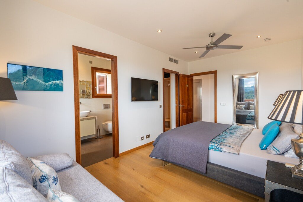 Der Außenbereich ist ebenso beeindruckend und verfügt über einen spektakulären beheizten Infinity-Pool sowie einen großen Whirlpool, die perfekt positioniert sind, um den herrlichen Ausblick über die Bucht von Pollensa zu genießen. Das wunderschön gepflegte Grundstück umfasst Terrassengärten, ausgewachsene mediterrane Pflanzen und eine elegante, weitläufige Auffahrt.