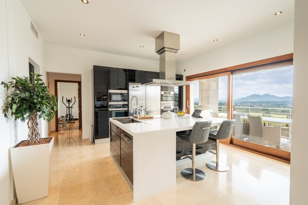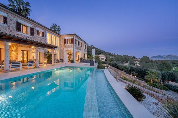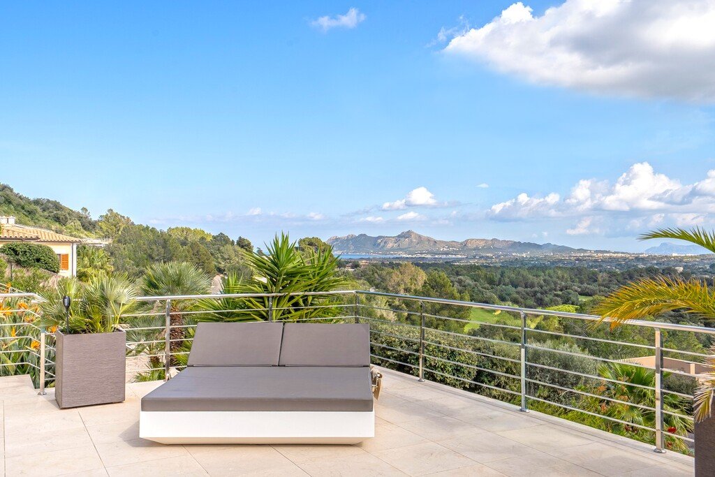 Auf einem erhöhten, nach Süden ausgerichteten Grundstück gelegen, bietet die Immobilie einen unverbauten Panoramablick über den Golfplatz, das Tramuntana-Gebirge und die atemberaubenden Buchten von Pollensa und Alcudia. Eine durchdachte Landschaftsgestaltung gewährleistet absolute Privatsphäre rund um die Villa, den Pool und die großzügigen Terrassen.