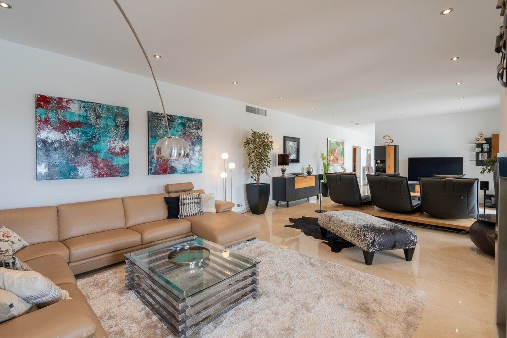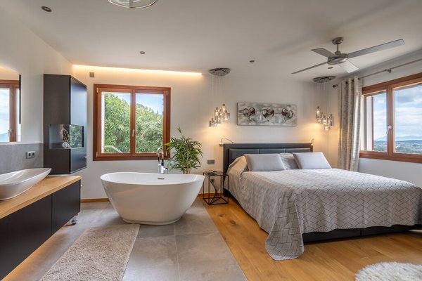 Die 2009 nach höchsten Standards erbaute, beeindruckende Villa bietet helle, elegante Wohnräume mit Einbauten aus massiver Eiche, Natursteinböden und hochwertigen Holzböden in den Schlafzimmern. Zu den modernen Annehmlichkeiten zählen Fußbodenheizung, eine vollwertige Klimaanlage und ein KNX-Smart-Home-System. Ein Aufzug ermöglicht den barrierefreien Zugang zu allen Ebenen.