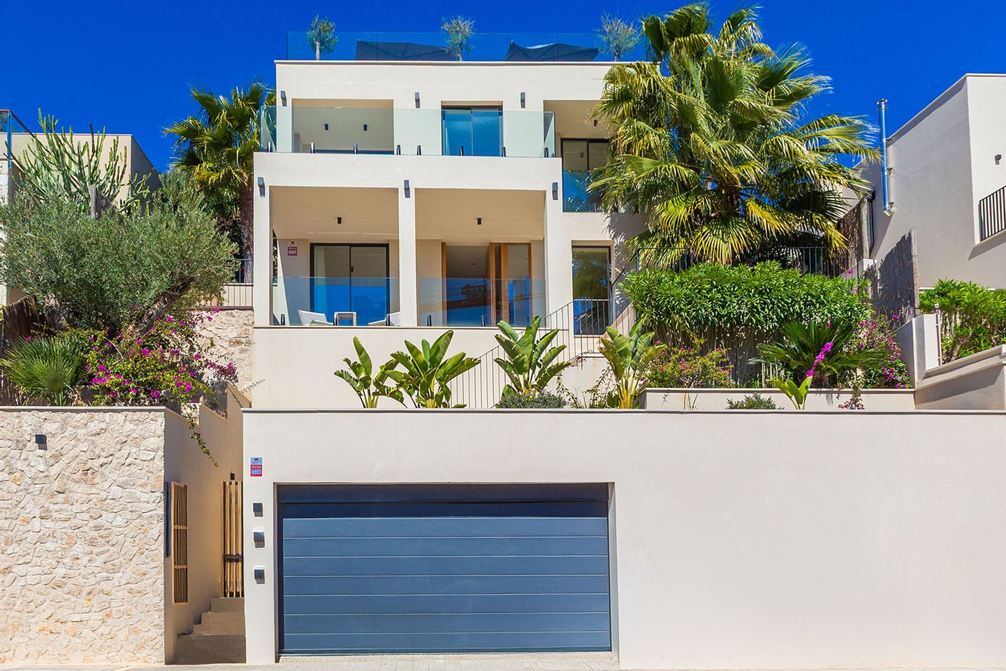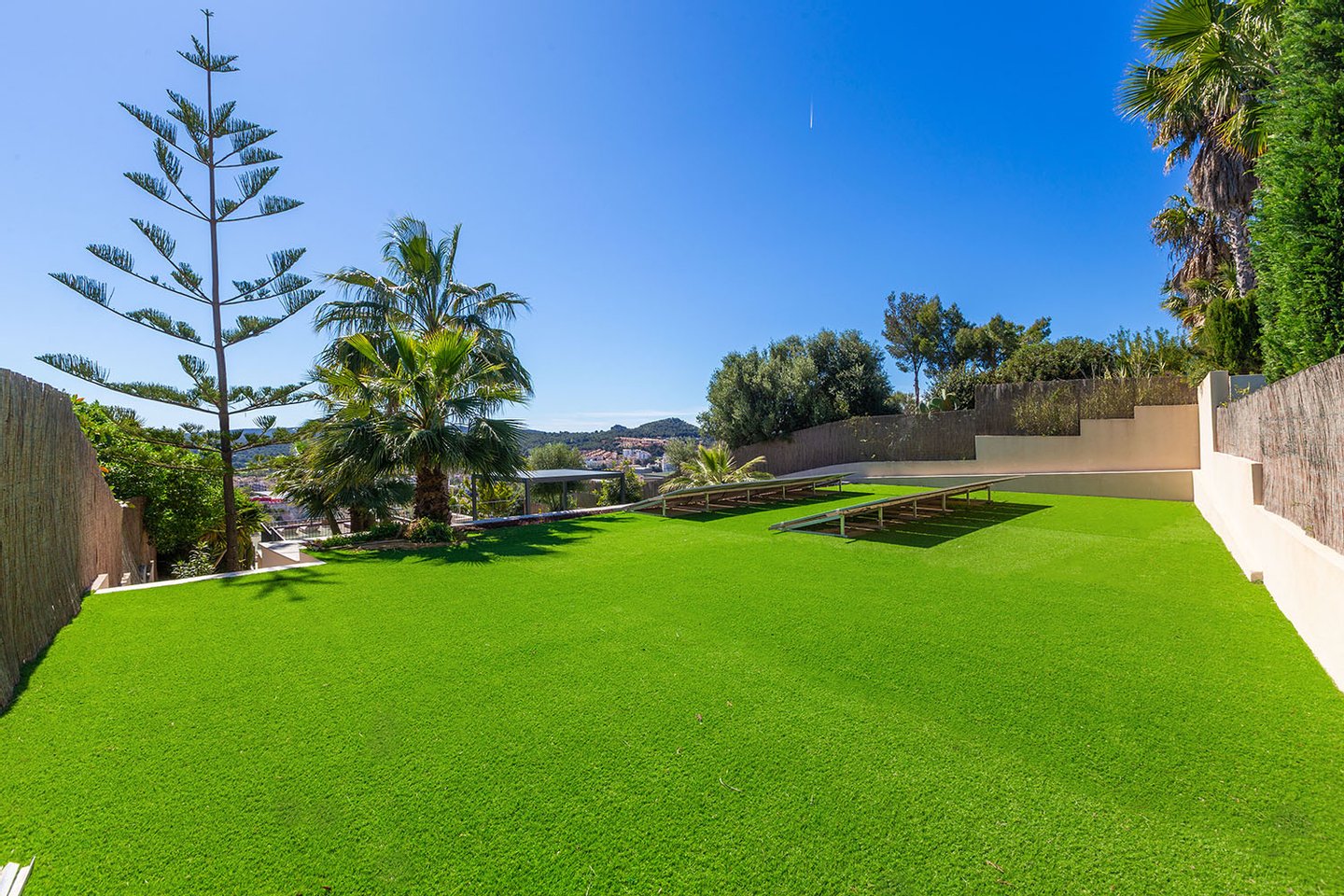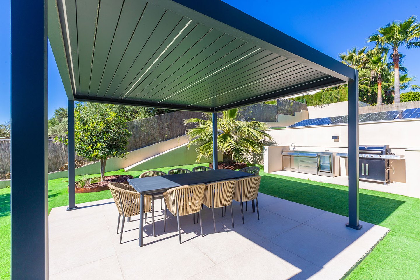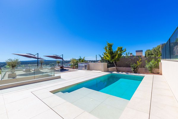 Besonders hervorzuheben sind die vielfältigen Außenflächen: Mehrere Terrassen laden zum Entspannen ein, während die großzügige Dachterrasse mit integriertem Pool, Sommerküche und Lounge-Bereich ein echtes Highlight darstellt. Von hier aus eröffnet sich ein spektakulärer Weitblick über die umliegende Landschaft bis hin zur Küste. Der gepflegte Garten mit mediterraner Bepflanzung bietet zusätzliche Rückzugsmöglichkeiten.
