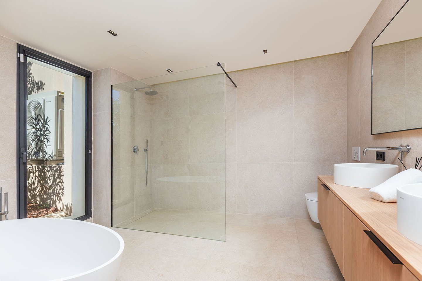 Hochwertige Natursteinböden, eine durchdachte Raumaufteilung sowie moderne Ausstattungselemente – darunter Fußbodenheizung, eine Klimaanlage mit Wärmerückgewinnung sowie eine Solaranlage – verleihen dieser Immobilie ihren exklusiven Charakter. Eine Garage mit Platz für zwei Fahrzeuge ergänzt das Angebot.