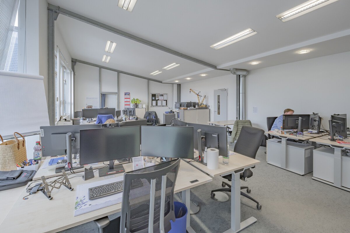 Die Gesamtfläche beträgt ca. 3.510 m². Im Bauabschnitt 1 stehen ca. 600 m² Verwaltungsfläche sowie ca. 1.650 m² Produktions- und Lagerfläche zur Verfügung. Bauabschnitt 2 ergänzt das Angebot um ca. 880 m² Produktions-/Lagerfläche. Insgesamt stehen rund 55 PKW-Stellplätze sowie zusätzliche Freiflächen zur Verfügung.