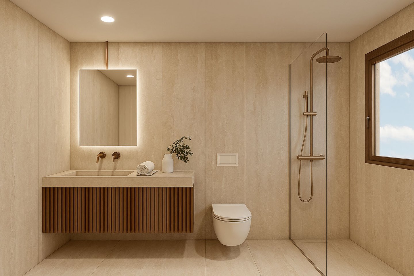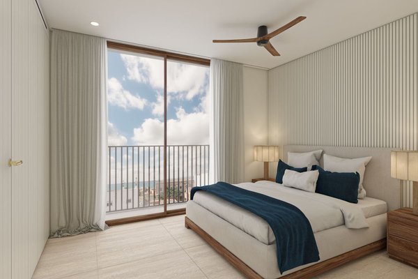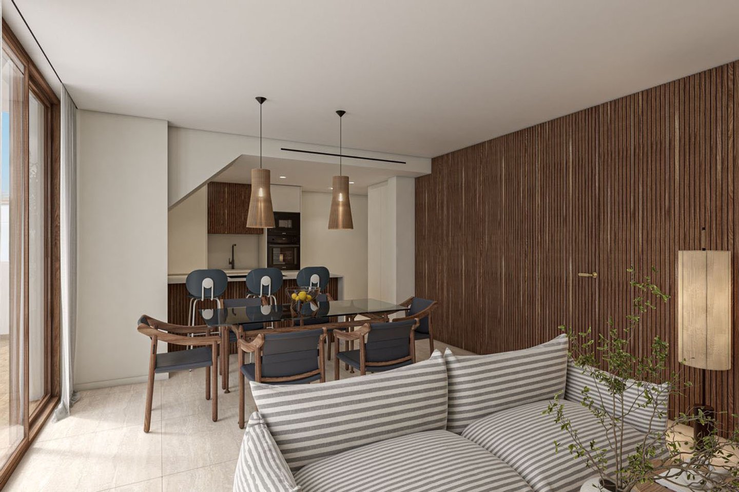 Das Apartment selbst überzeugt durch eine durchdachte Raumaufteilung sowie eine hochwertige, mediterran-moderne Ausstattung. Großzügige Fensterflächen sorgen für viel Tageslicht und schaffen fließende Übergänge zwischen Innen- und Außenbereich. Edle Materialien, klare Linien und warme Holzelemente verleihen den Räumen eine elegante und zugleich einladende Atmosphäre.