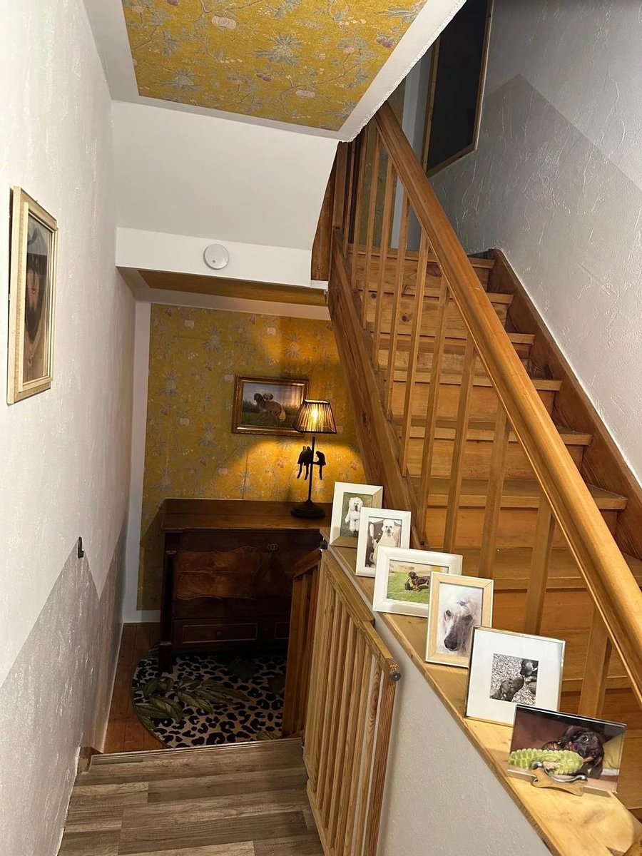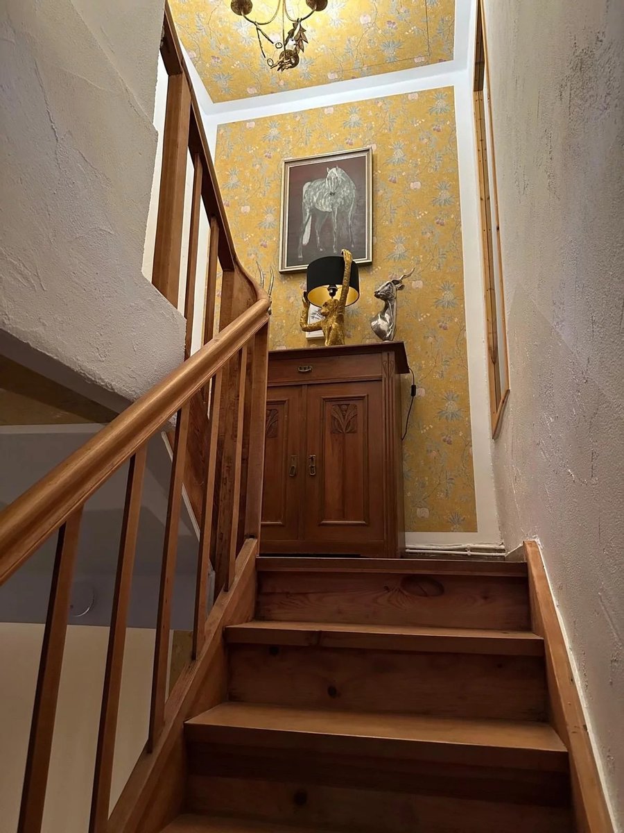 Über das stilvolle Treppenhaus gelangen Sie in die oberen Etagen, in denen sich das Elternschlafzimmer und das moderne Badezimmer befinden. Das Zwischengeschoss empfängt Sie mit einem offenen, lichtdurchfluteten Wohn- und Essbereich, der direkt auf die großzügige Terrasse mit Sitzecke führt.