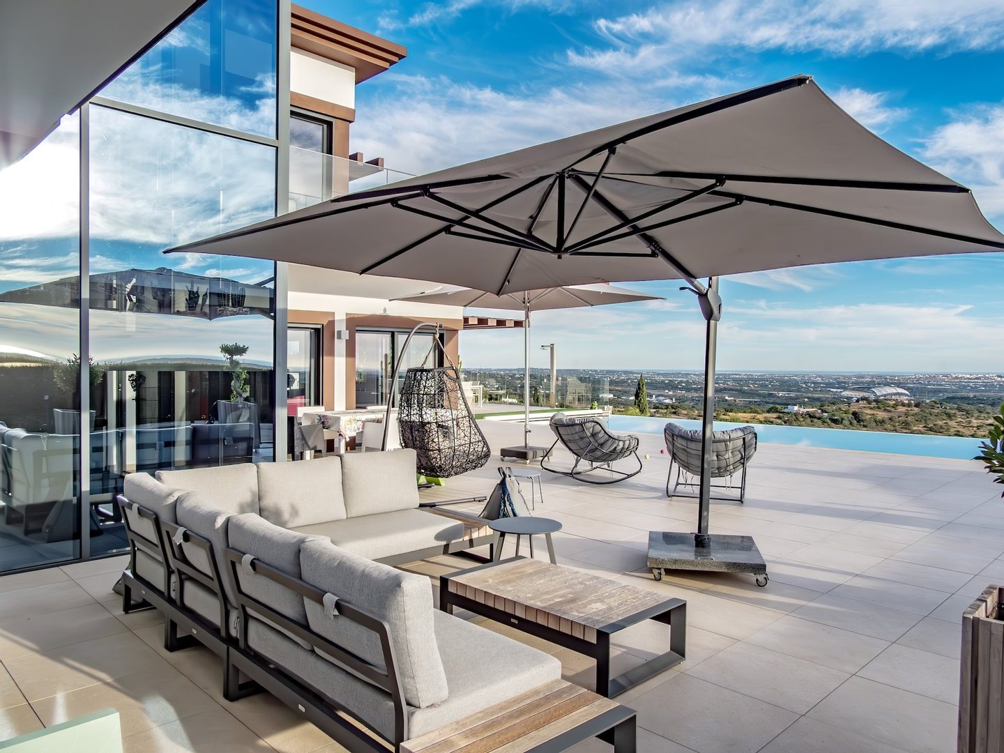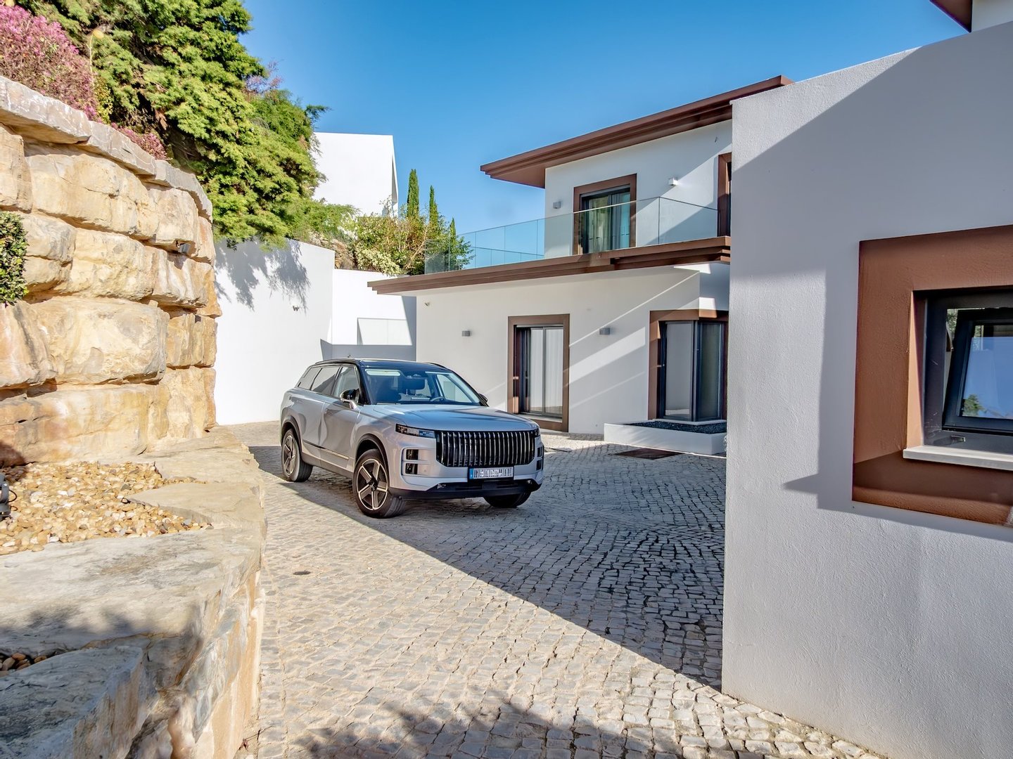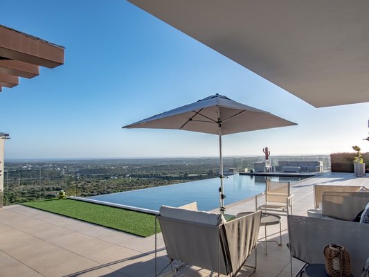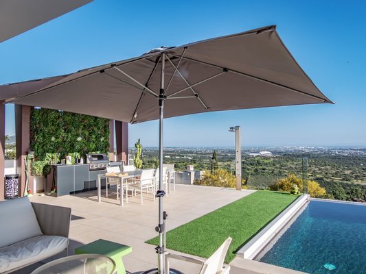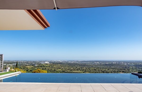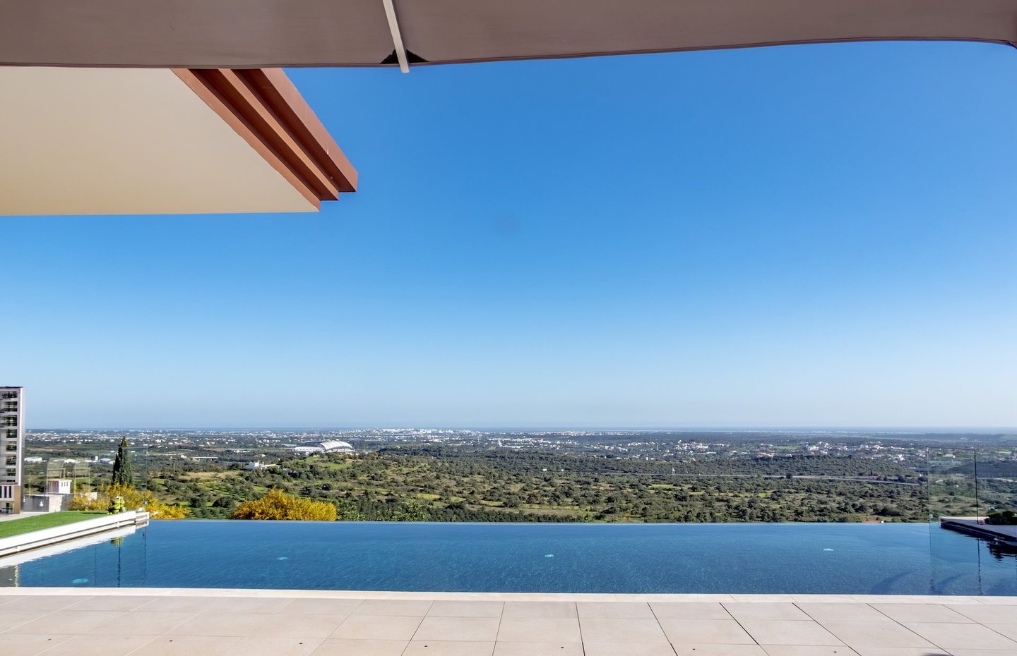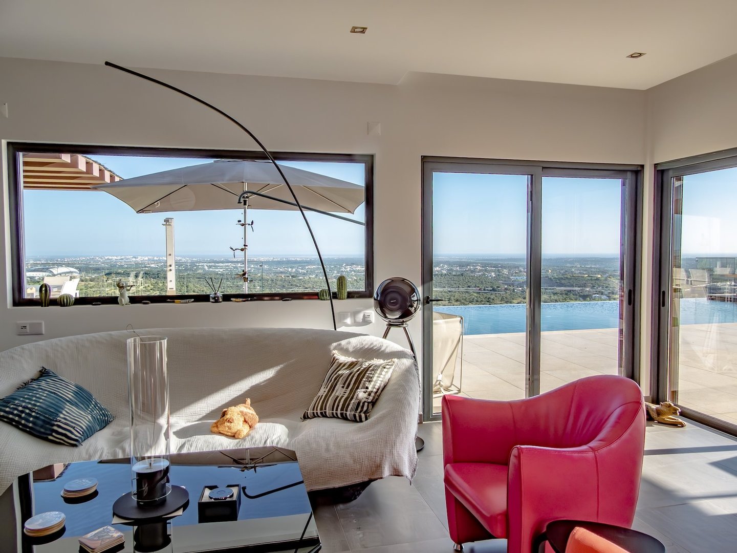 Außergewöhnliche Villa in privilegierter Lage mit 180° Panoramaausblick von Olhão bis Vilamoura. Das Erdgeschoss verfügt über einen zweistöckigen Eingangsbereich mit direktem Blick auf den Pool, der viel natürliches Licht hereinlässt. Das großzügige Wohnzimmer bietet einen spektakulären Ausblick, tagsüber wie nachts. Die moderne, voll ausgestattete Küche mit Mittelinsel öffnet sich über eine große Glastrennwand zum Wohnbereich und schafft eine warme, harmonische Atmosphäre. Zu diesem Niveau gehört auch zwei großzügige Schlafzimmer mit eigenem Bad. Draußen genießen Sie einen großzügigen Poolrandbereich, einen Grillbereich mit großem Esstisch sowie mehrere Entspannungs- und Outdoor-Wangaroasen um die Terrasse. Das erste Obergeschoss ist einer luxuriösen Elternsuite gewidmet, ausgestattet mit einem großen Bad, einer Ankleide und einem zweiten separaten Ankleidebereich. Ein viertes Schlafzimmer mit Bad vervollständigt diese Etage und bietet beide komfortable Terrassen, von denen aus Sie die atemberaubenden Ausblicke genießen können. Im Untergeschoss befindet sich ein hochwertiges Heimkino, das auf Wunsch in einen privaten Salon oder einen Spielraum umgewandelt werden kann, außerdem eine Garderobe, eine Waschküche, ein Weinraum und eine riesige Garage für bis zu 5 Autos. Die Immobilie verfügt über eine Solar.anlage zur Energieeffizienz, Fußbodenheizung (Luft-Wasser), Klimaanlagen und weitere Annehmlichkeiten. Diese prächtige Villa liegt nur 5 Autominuten von allen Annehmlichkeiten entfernt und 10 Autominuten vom Flughafen Faro. Die Lage eignet sich ideal für das ganzjährige Wohnen in der Algarve mit der Familie. Kontaktieren Sie uns für eine Besichtigung – Sie werden sich sicher in diese wundervolle Villa verlieben.