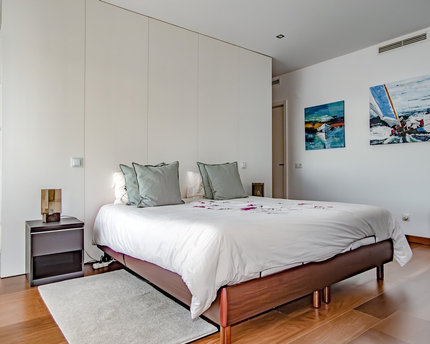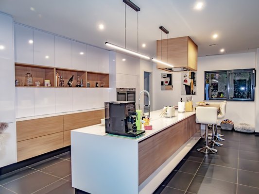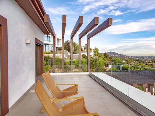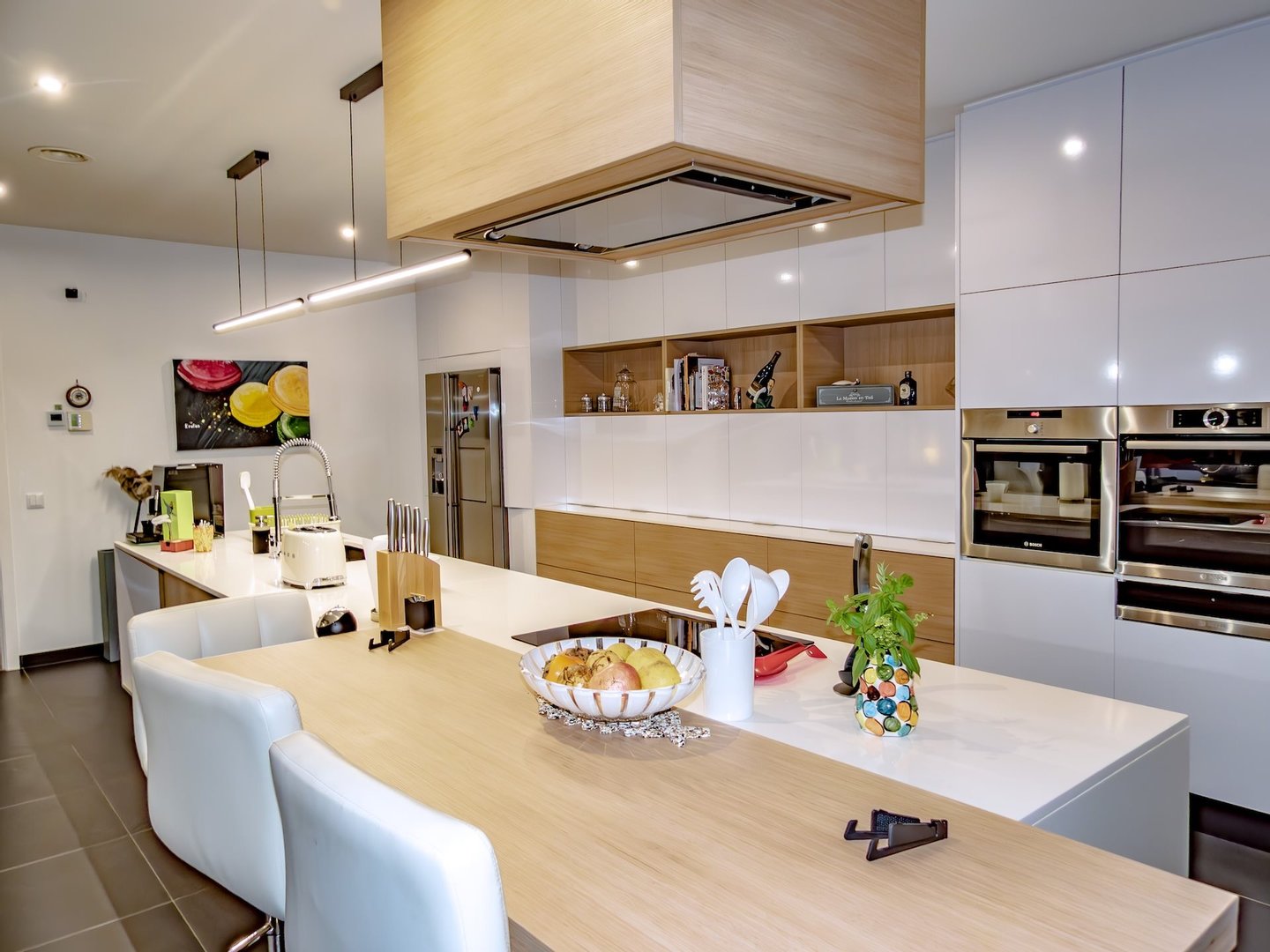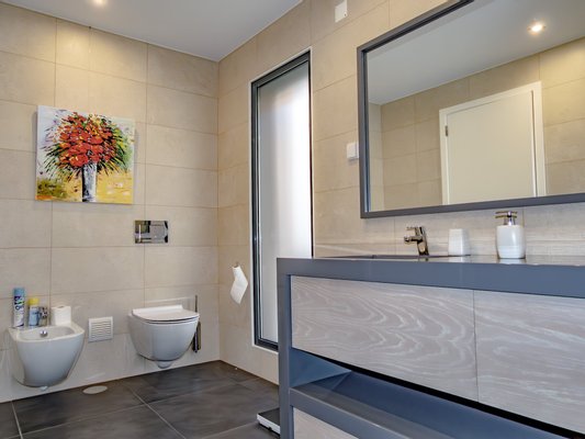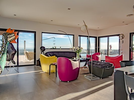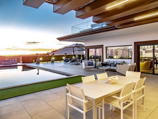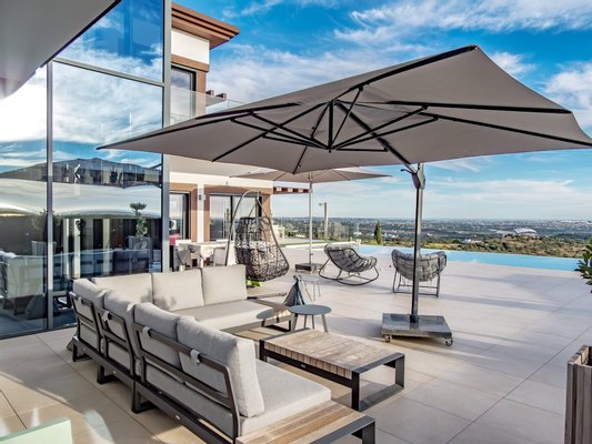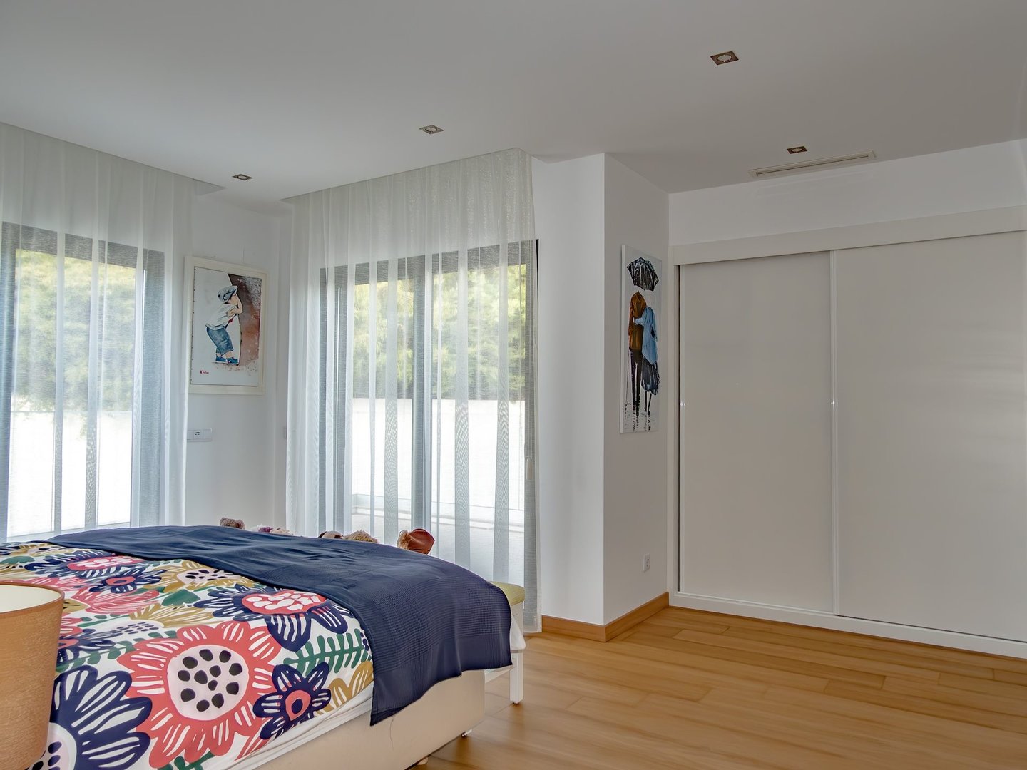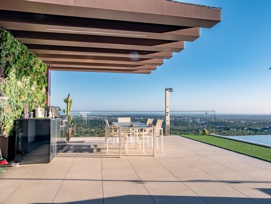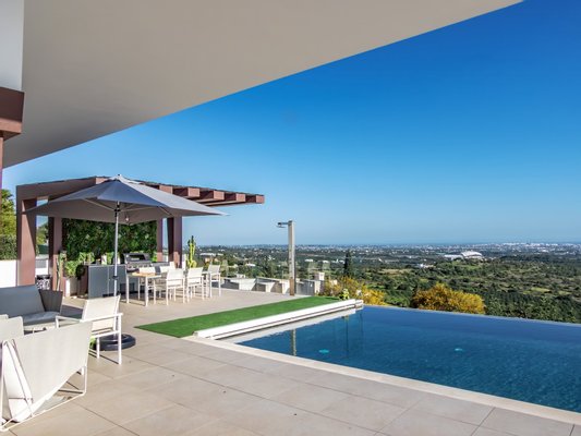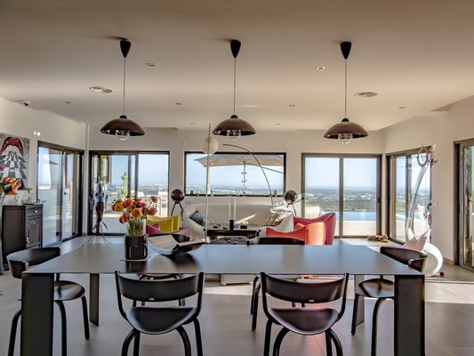 Außergewöhnliche Villa in privilegierter Lage mit 180° Panoramaausblick von Olhão bis Vilamoura. Das Erdgeschoss verfügt über einen zweistöckigen Eingangsbereich mit direktem Blick auf den Pool, der viel natürliches Licht hereinlässt. Das großzügige Wohnzimmer bietet einen spektakulären Ausblick, tagsüber wie nachts. Die moderne, voll ausgestattete Küche mit Mittelinsel öffnet sich über eine große Glastrennwand zum Wohnbereich und schafft eine warme, harmonische Atmosphäre. Zu diesem Niveau gehört auch zwei großzügige Schlafzimmer mit eigenem Bad. Draußen genießen Sie einen großzügigen Poolrandbereich, einen Grillbereich mit großem Esstisch sowie mehrere Entspannungs- und Outdoor-Wangaroasen um die Terrasse. Das erste Obergeschoss ist einer luxuriösen Elternsuite gewidmet, ausgestattet mit einem großen Bad, einer Ankleide und einem zweiten separaten Ankleidebereich. Ein viertes Schlafzimmer mit Bad vervollständigt diese Etage und bietet beide komfortable Terrassen, von denen aus Sie die atemberaubenden Ausblicke genießen können. Im Untergeschoss befindet sich ein hochwertiges Heimkino, das auf Wunsch in einen privaten Salon oder einen Spielraum umgewandelt werden kann, außerdem eine Garderobe, eine Waschküche, ein Weinraum und eine riesige Garage für bis zu 5 Autos. Die Immobilie verfügt über eine Solar.anlage zur Energieeffizienz, Fußbodenheizung (Luft-Wasser), Klimaanlagen und weitere Annehmlichkeiten. Diese prächtige Villa liegt nur 5 Autominuten von allen Annehmlichkeiten entfernt und 10 Autominuten vom Flughafen Faro. Die Lage eignet sich ideal für das ganzjährige Wohnen in der Algarve mit der Familie. Kontaktieren Sie uns für eine Besichtigung – Sie werden sich sicher in diese wundervolle Villa verlieben.