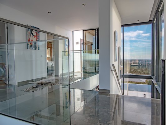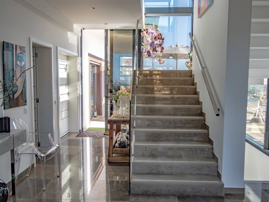 Außergewöhnliche Villa in privilegierter Lage mit 180° Panoramaausblick von Olhão bis Vilamoura. Das Erdgeschoss verfügt über einen zweistöckigen Eingangsbereich mit direktem Blick auf den Pool, der viel natürliches Licht hereinlässt. Das großzügige