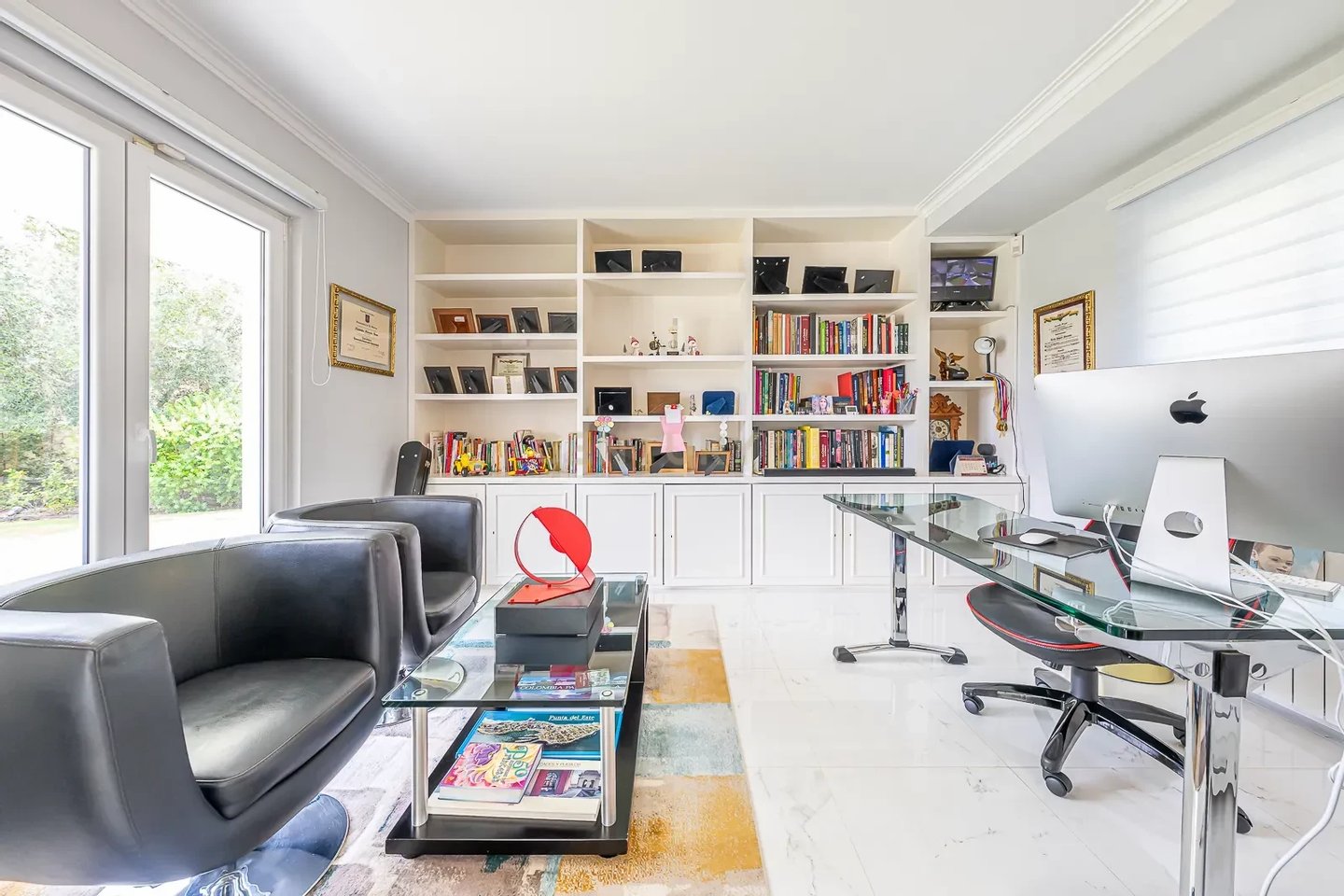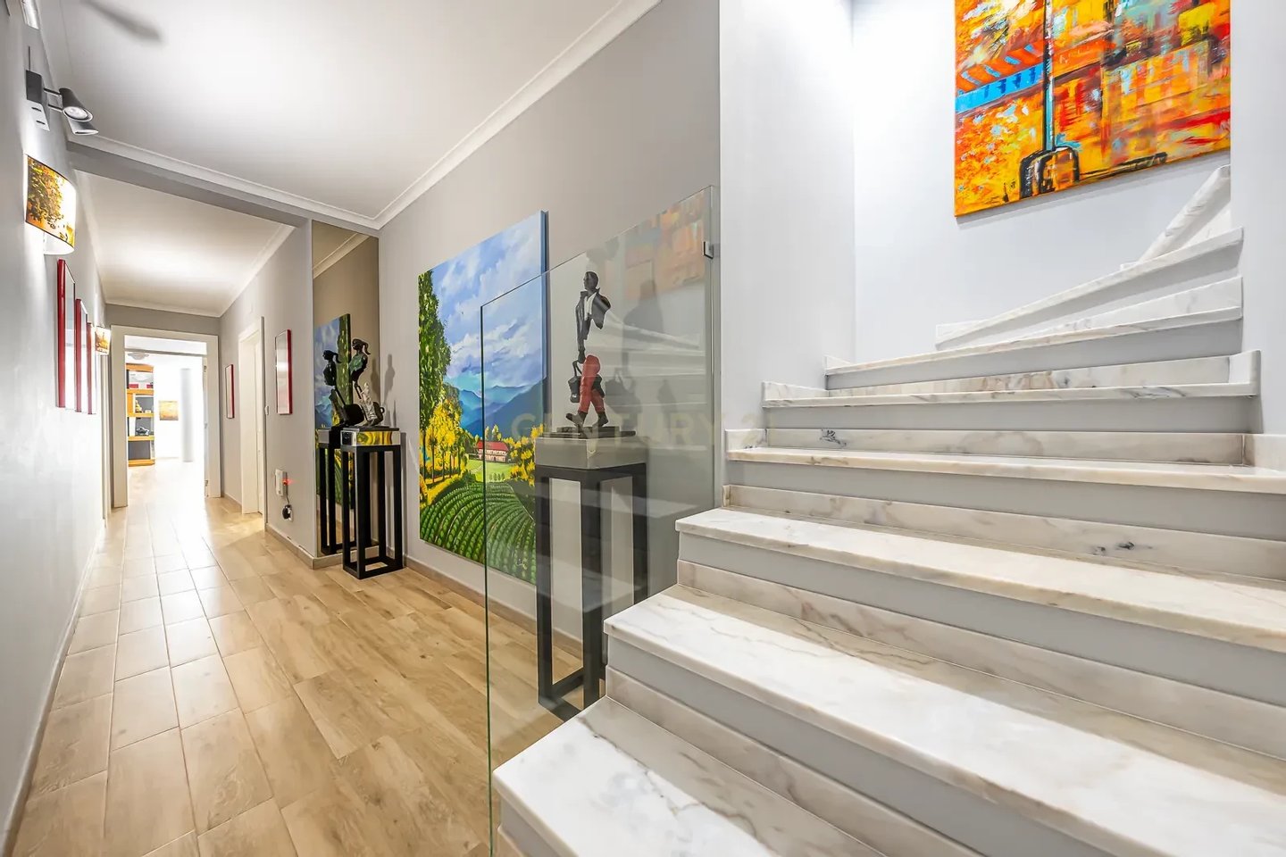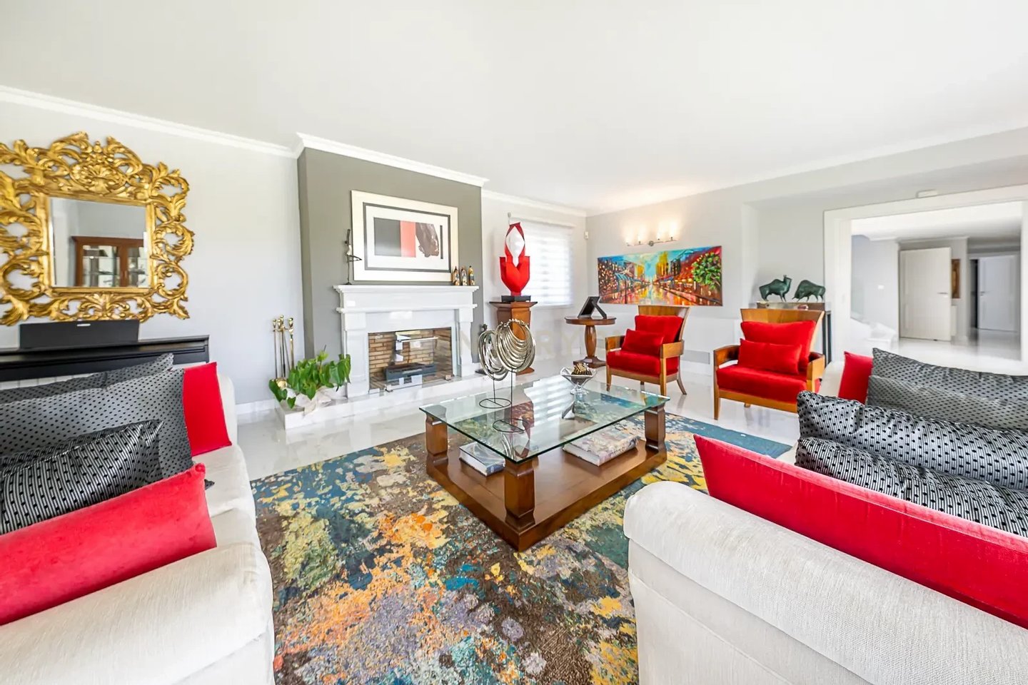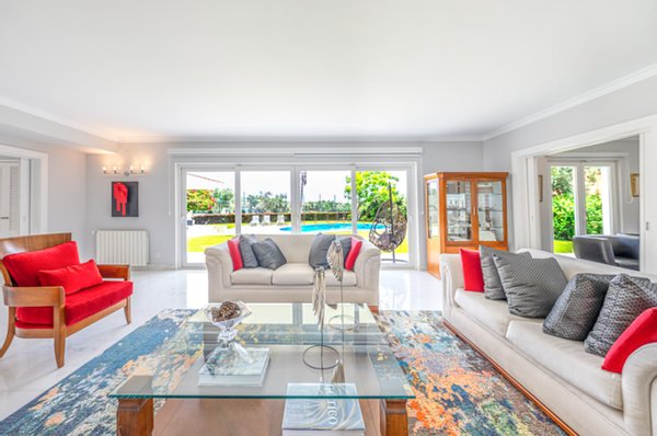 Im Erdgeschoss befinden sich eine großzügige Eingangshalle, ein großes Wohnzimmer mit Kamin, ein Esszimmer und ein Büro, alles mit direktem Zugang zum großen Garten und Schwimmbad.