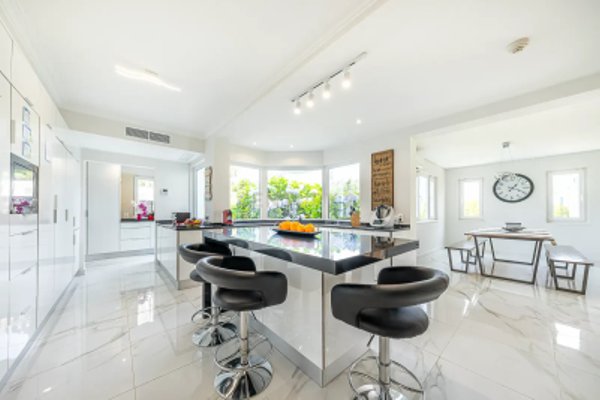 Ausgestattete Küche mit großzügigen Bereichen und Speisekammer, großer Essbereich, alles mit direktem Zugang zum Garten