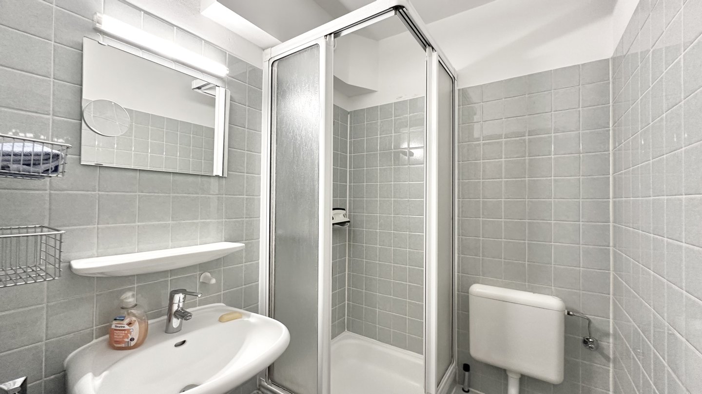 Zusätzlich steht Ihnen ein weiteres Badezimmer mit Nasszelle, Toilette und Waschbecken zur Verfügung.
