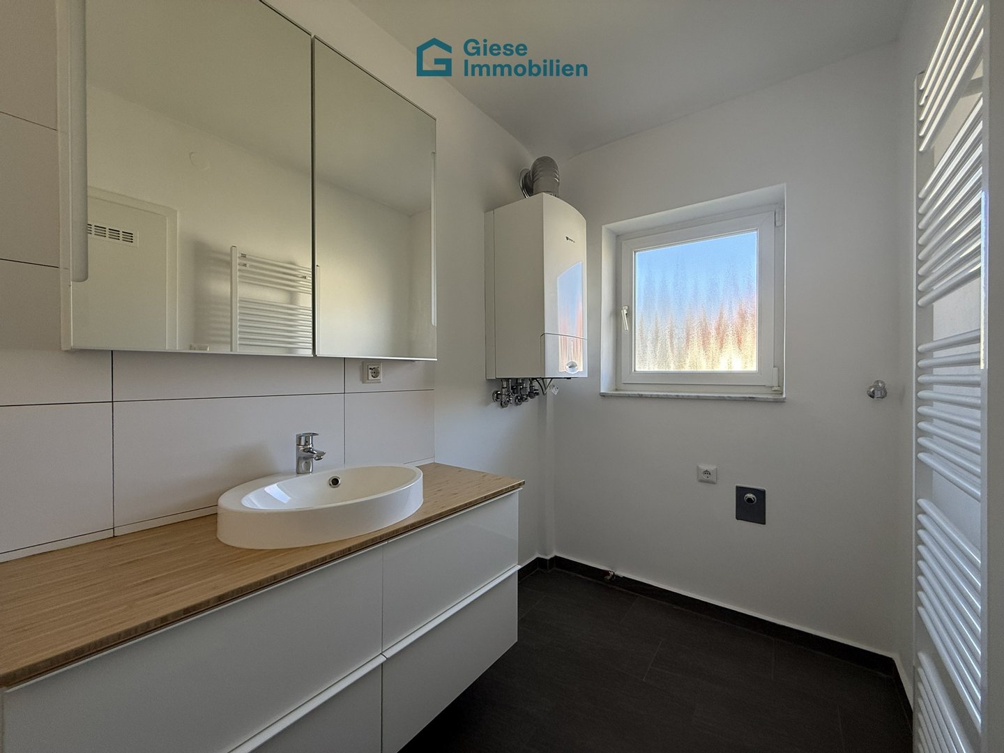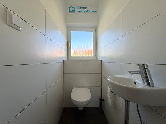 Das Tageslichtbadezimmer ist mit einer Badewanne, Badezimmermöbeln wie abgebildet sowie einem Waschmaschinenanschluss ausgestattet. Hier befindet sich auch die Gastherme, welche für die Beheizung der Wohnung und die Warmwasseraufbereitung zuständig ist. Ergänzend steht ein separates WC mit Fenster zur Verfügung.