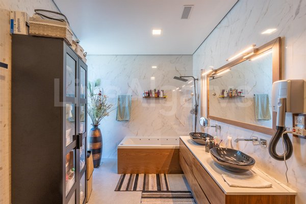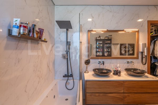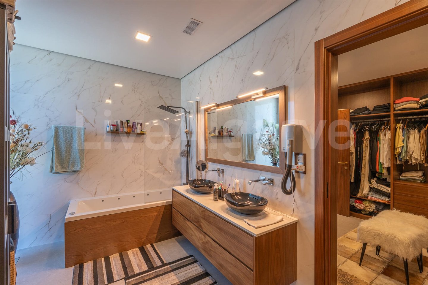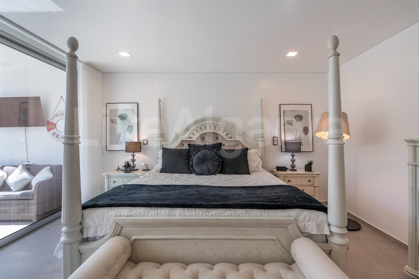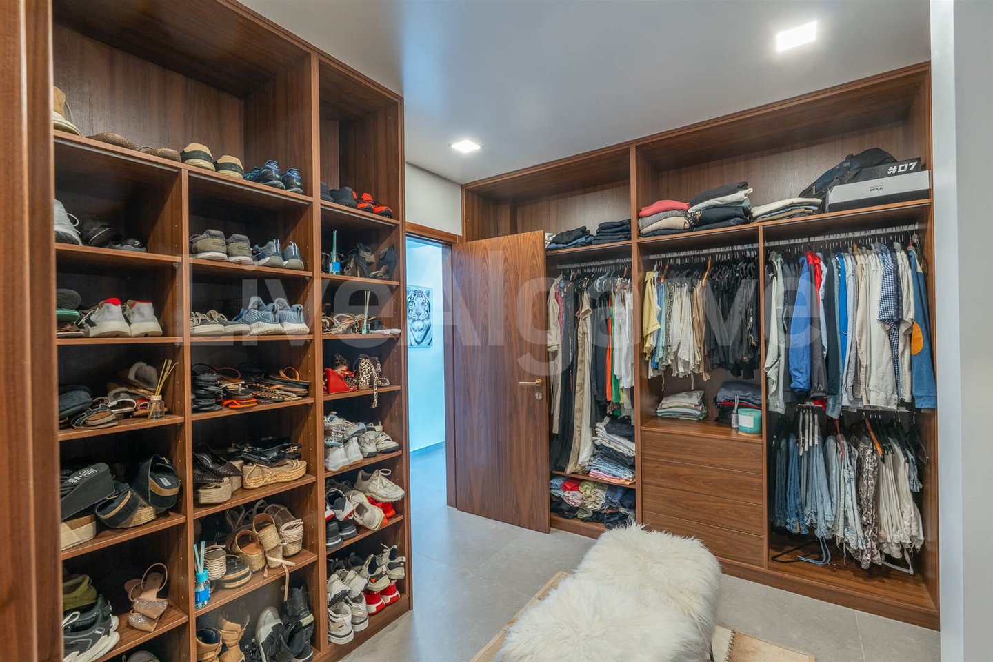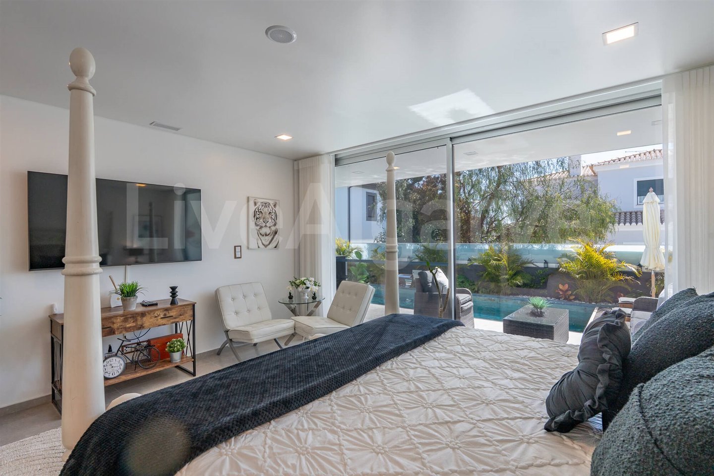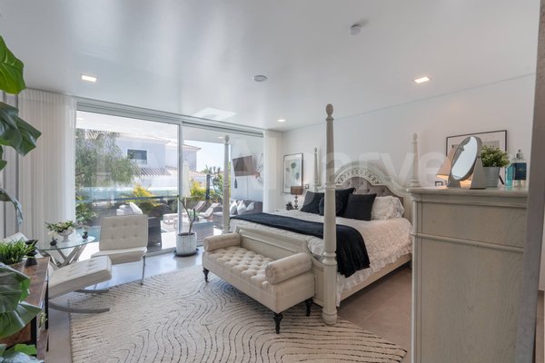 Die Hauptsuite nimmt eine privilegierte Position in der Villa ein. Der direkte Zugang zur Poolterrasse stärkt die Verbindung zwischen Innen- und Außenwohnen. Ein geräumiger begehbarer Kleiderschrank bietet Stauraum, den viele zeitgenössische Hausbesitzer als essenziell erachten.