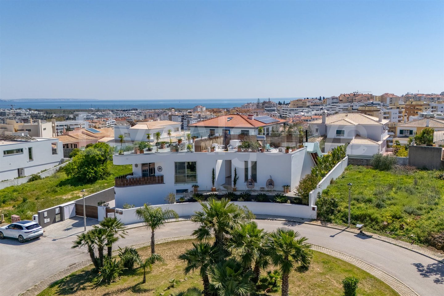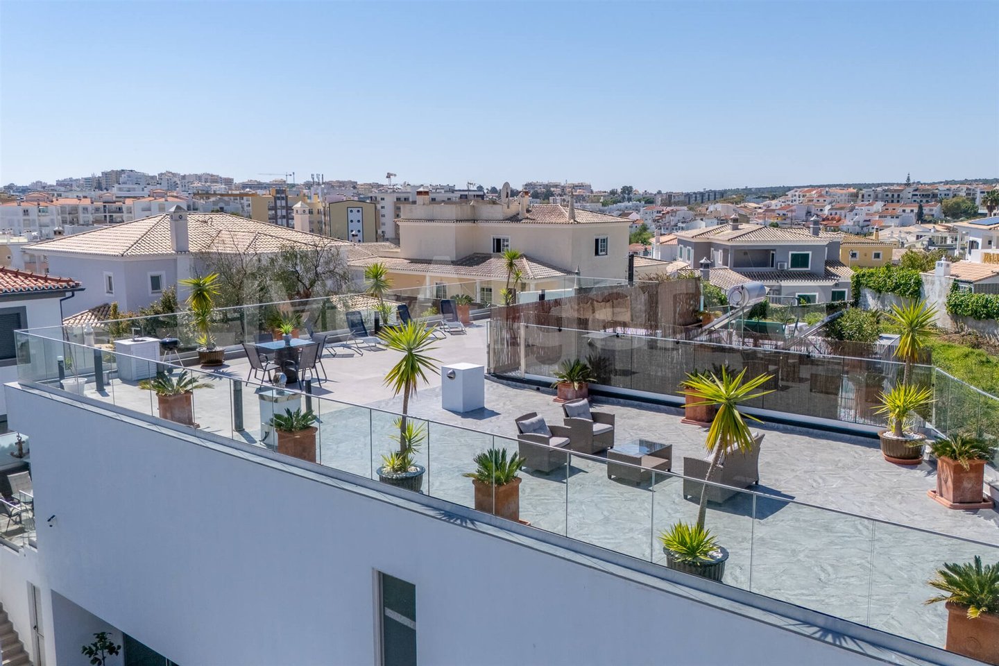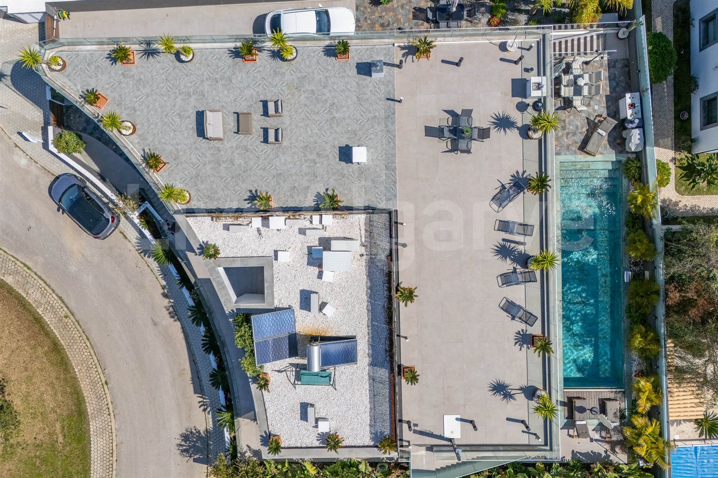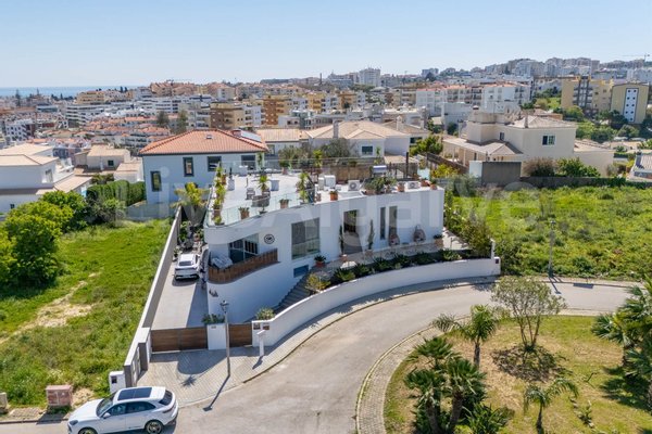 Terrassenflächen spielen eine zentrale Rolle im Grundriss der Immobilie. Von den oberen Dachterrassen aus eröffnet sich Blick auf den Atlantik über die umliegende Nachbarschaft. Die Terrasse ist großzügig dimensioniert und bietet Platz für Speisen- oder Lounge-Einrichtungen, was die Nutzung des milden Klimas der Algarve fördert.