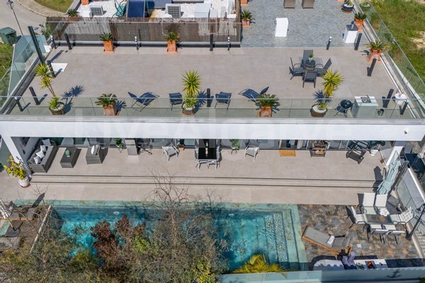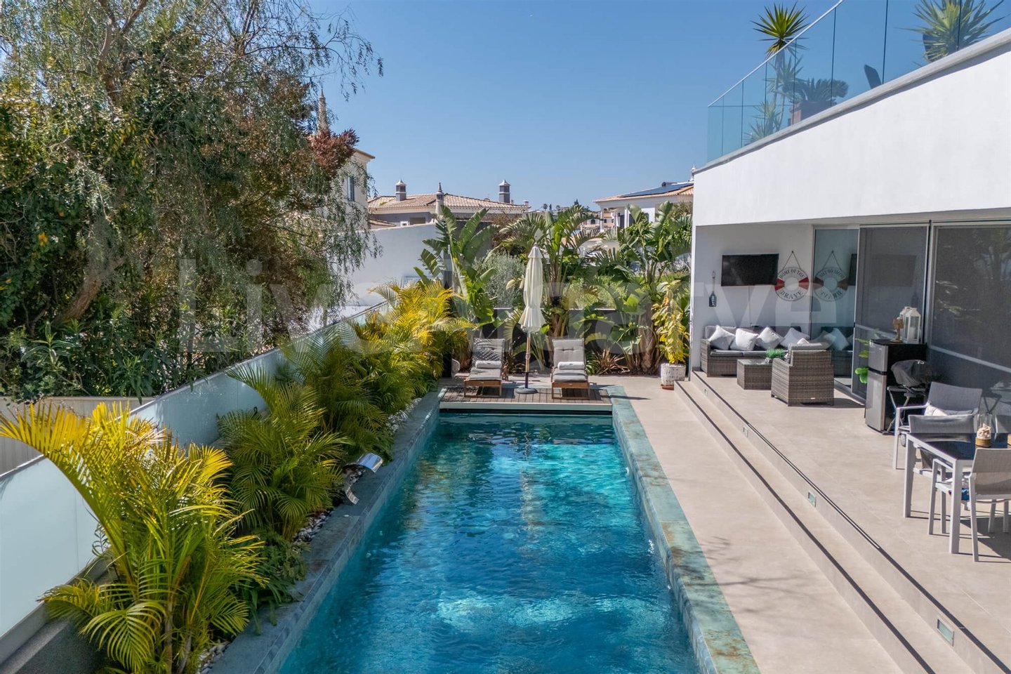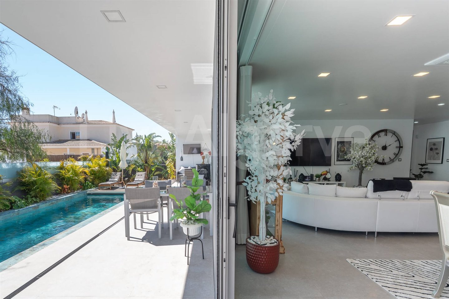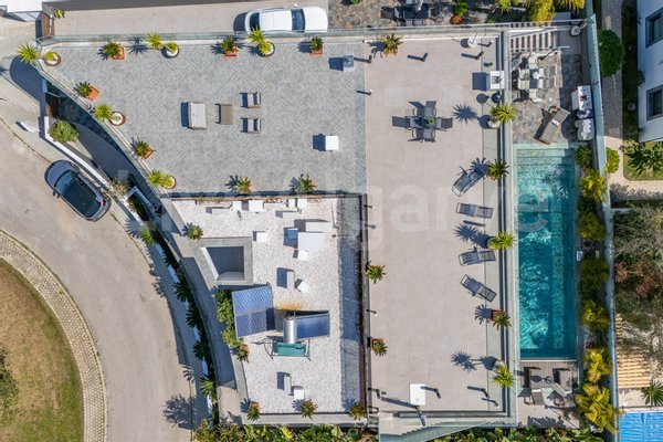 Terrassenflächen spielen eine zentrale Rolle im Grundriss der Immobilie. Von den oberen Dachterrassen aus eröffnet sich Blick auf den Atlantik über die umliegende Nachbarschaft. Die Terrasse ist großzügig dimensioniert und bietet Platz für Speisen- oder Lounge-Einrichtungen, was die Nutzung des milden Klimas der Algarve fördert.