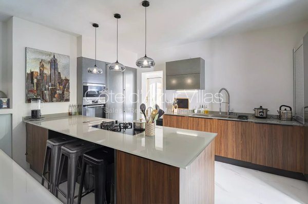 Beim Eintritt öffnet sich ein großzügiger Empfangsbereich, mit natürlichem Licht durchflutet, auf großzügige Terrassen gegenüber dem Blick, während der Kamin für eine behagliche Atmosphäre das ganze Jahr über sorgt. Die elegante, perfekt ausgestattete Küche wird Liebhaber von Geselligkeit und Gastronomie ansprechen. Eine ebenerdige Hauptsuite mit direktem Zugang zu einer privaten Terrasse vervollständigt diese Ebene mit Komfort und Privatsphäre.