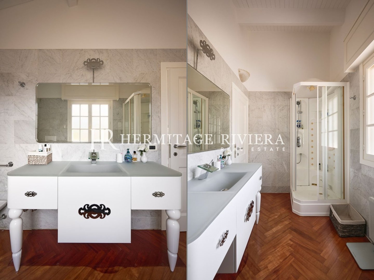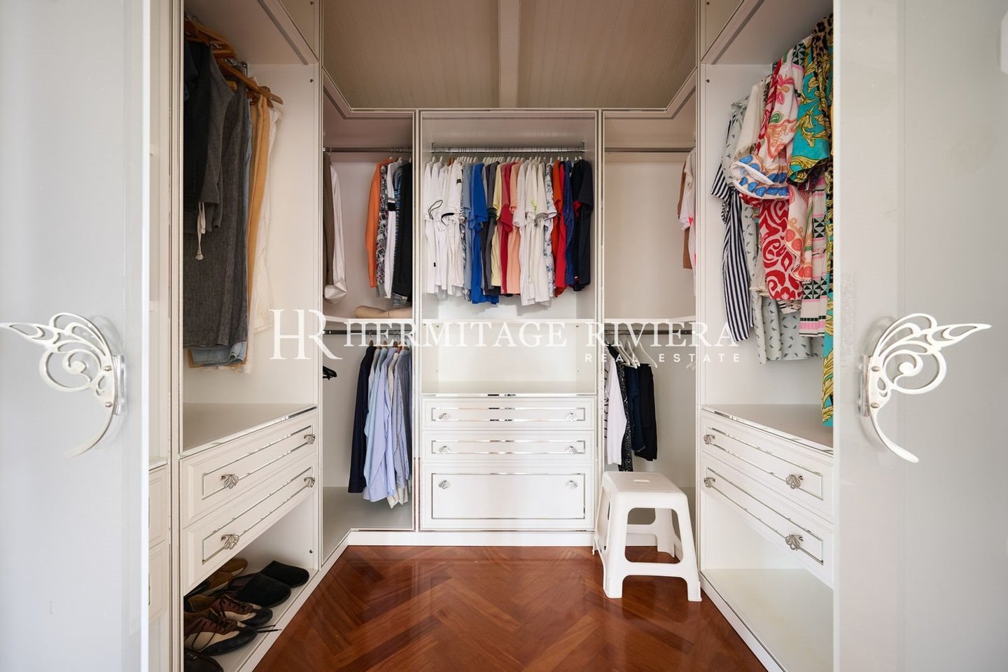 Der obere Stock ist der Master-Suite vorbehalten, die ein privates Badezimmer und ein geräumiges Ankleidezimmer umfasst und zu einer großen Dachterrasse mit panoramablick auf das Meer, die Bucht von Menton und die italienische Küste führt.