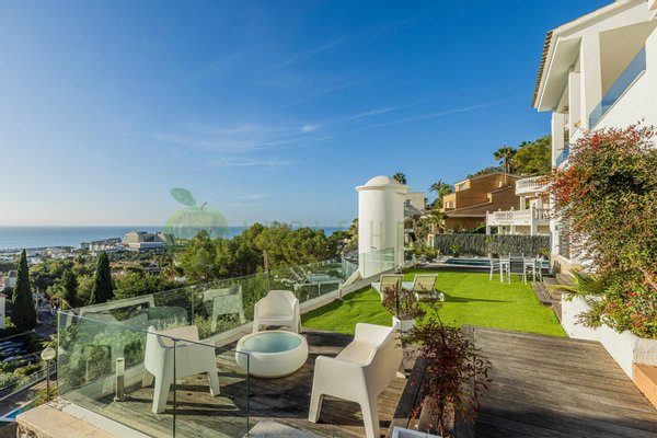 Exceptional Mediterranean-style house located in the prestigious La Levantina urbanization in Sitges, with panoramic sea views from every corner. Fully renovated, this modern home combines warm and bright interiors with large outdoor spaces including