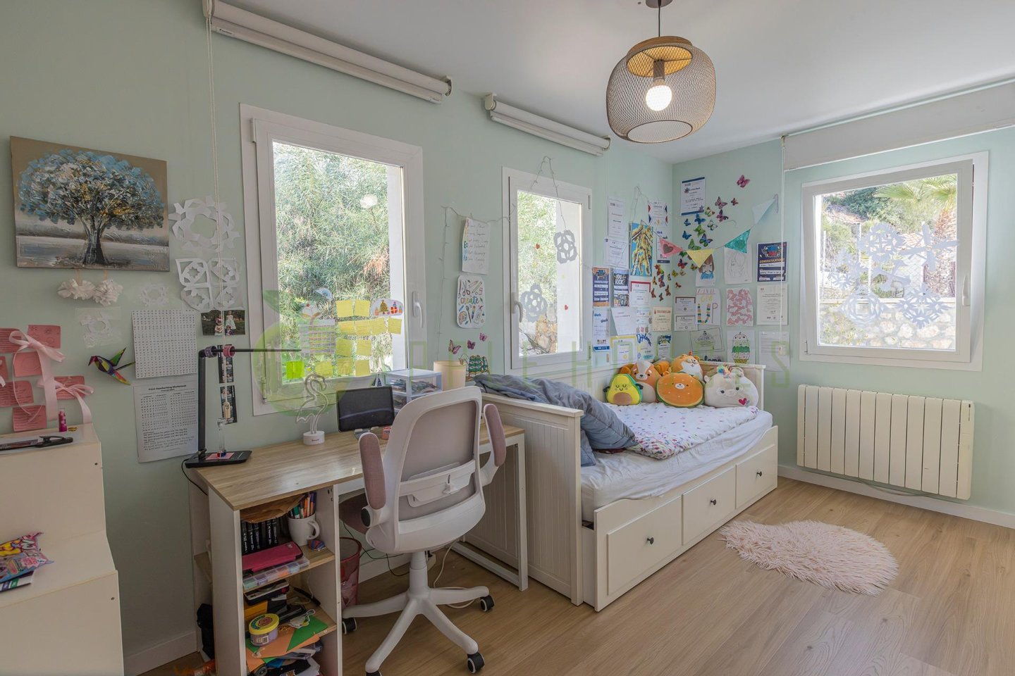 The main floor offers an open living and dining room with access to the terrace, a fully equipped kitchen with dining area, a full bathroom and a versatile double bedroom that can function as an office. On the upper floor, the master suite features a dressing room, en-suite bathroom and private terrace, while two other bedrooms share a bathroom.