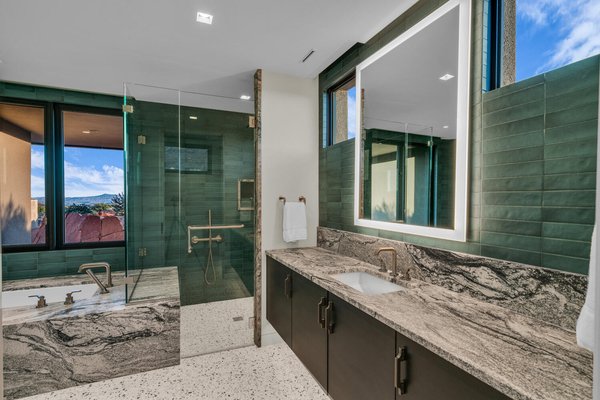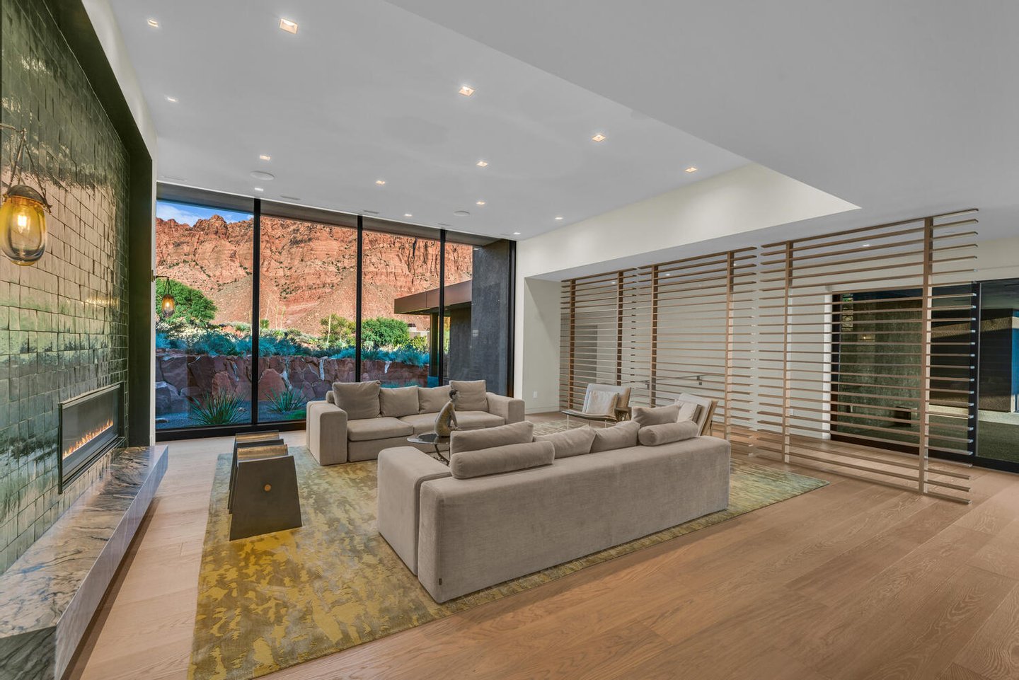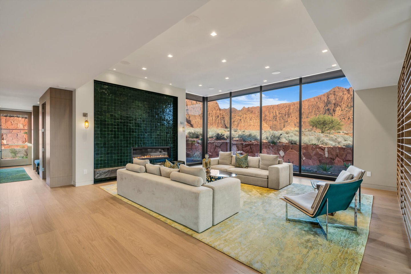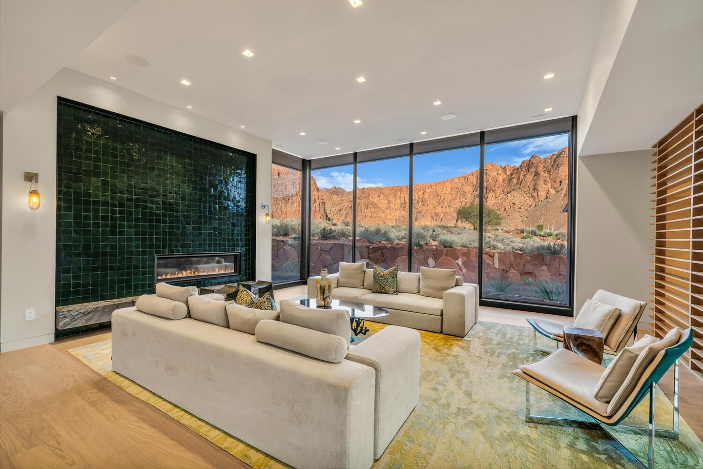 Im Herzen der Residenz befindet sich das durchdacht gestaltete Wohnzimmer – vorgestellt im Architectural Digest – mit einer markanten gefliesten Kaminwand, die von der umliegenden Wüstenlandschaft inspiriert ist. Reiche Texturen und eine nuancierte grüne Glasur spiegeln die Töne der Klippen und Vegetation jenseits der weitläufigen Fensterwand wider und schaffen einen dramatischen Fokuspunkt, der die Schönheit der Wüste direkt ins Innere bringt.