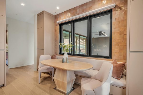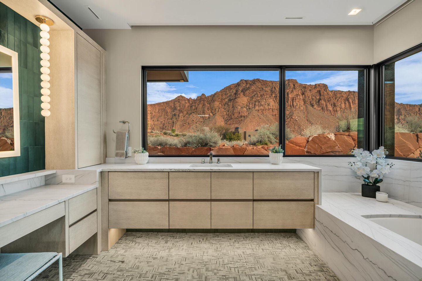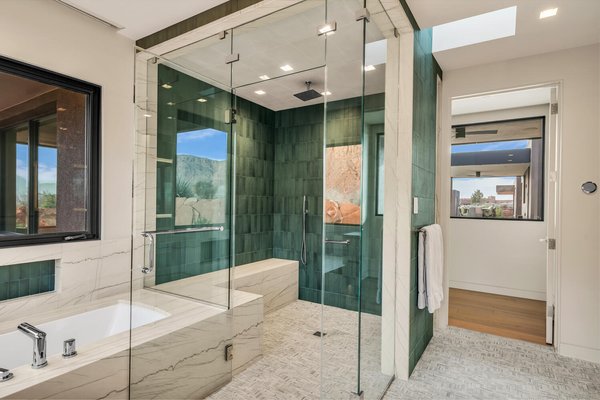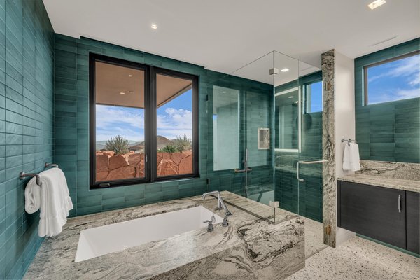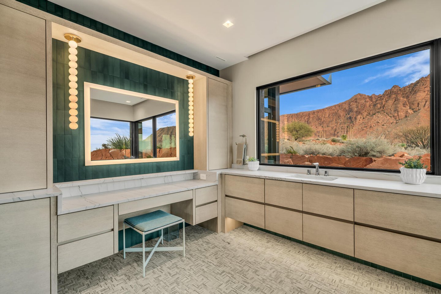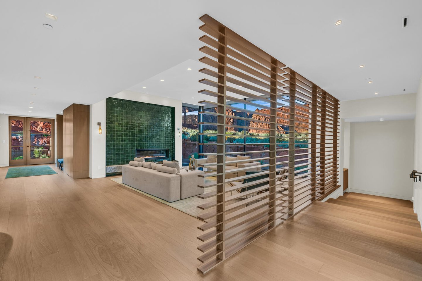 Im Herzen der Residenz befindet sich das durchdacht gestaltete Wohnzimmer – vorgestellt im Architectural Digest – mit einer markanten gefliesten Kaminwand, die von der umliegenden Wüstenlandschaft inspiriert ist. Reiche Texturen und eine nuancierte grüne Glasur spiegeln die Töne der Klippen und Vegetation jenseits der weitläufigen Fensterwand wider und schaffen einen dramatischen Fokuspunkt, der die Schönheit der Wüste direkt ins Innere bringt.