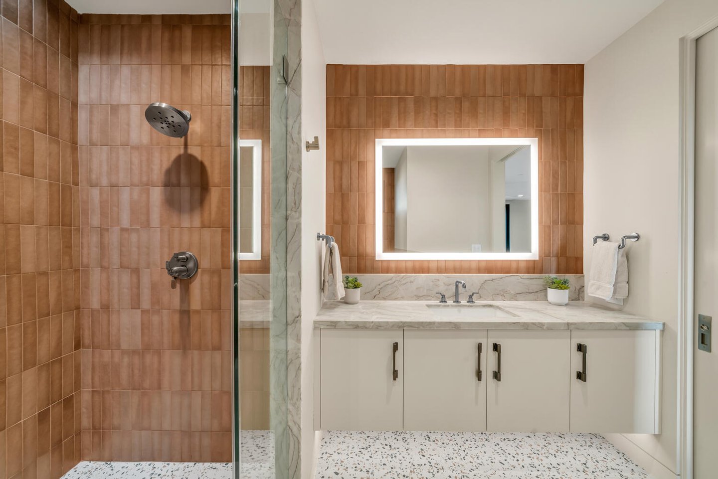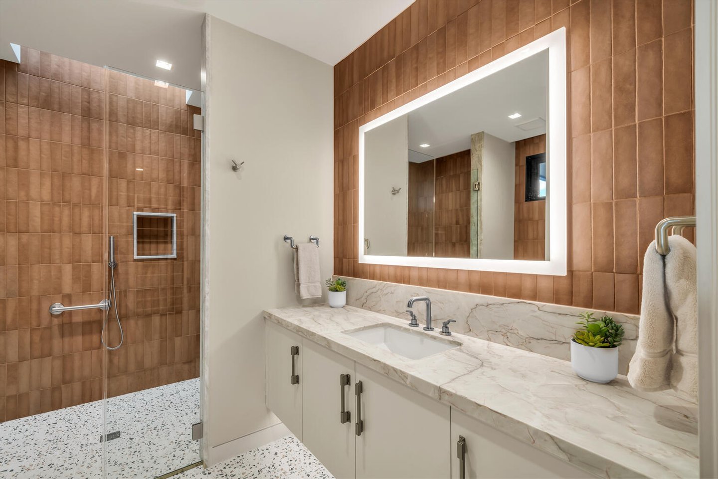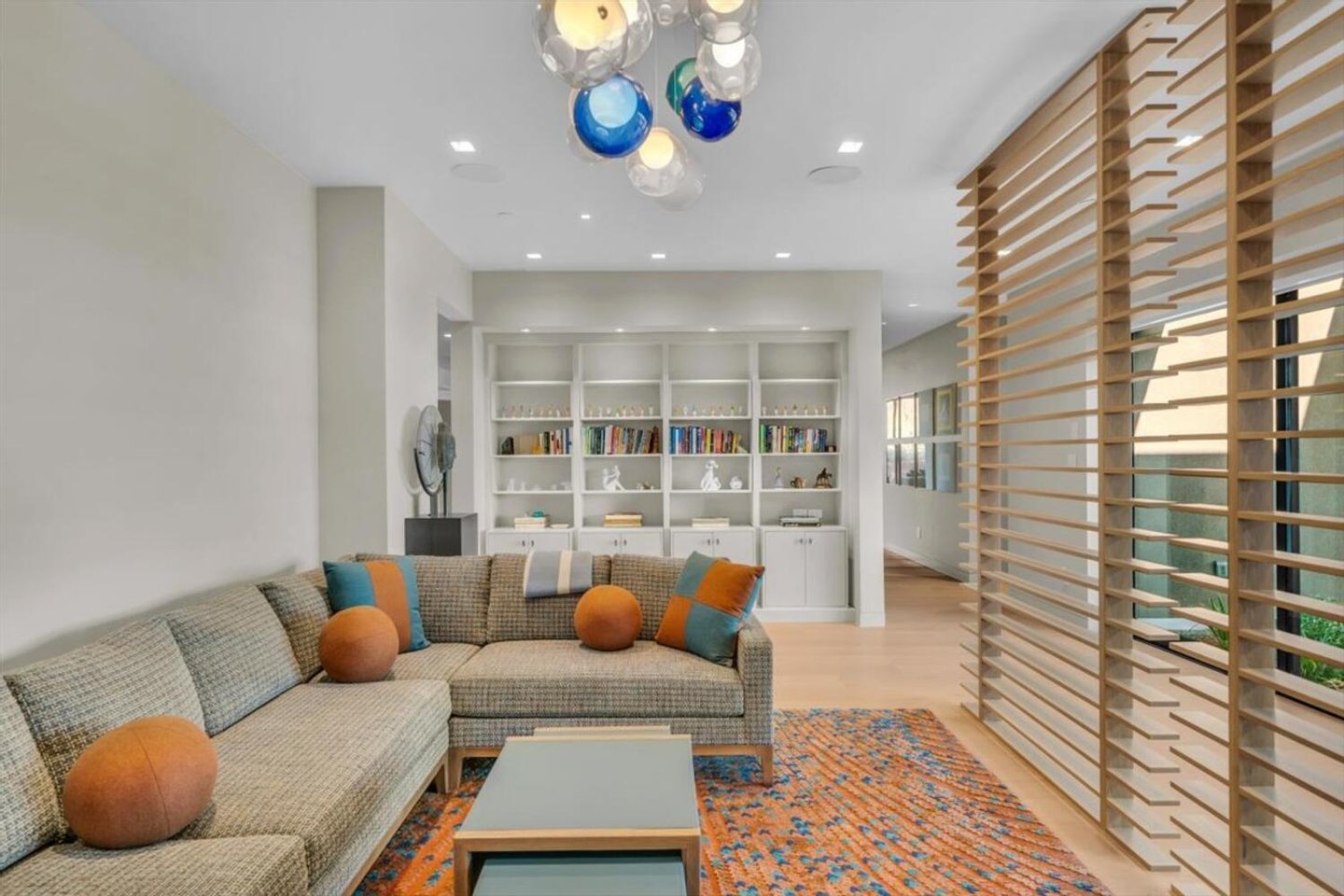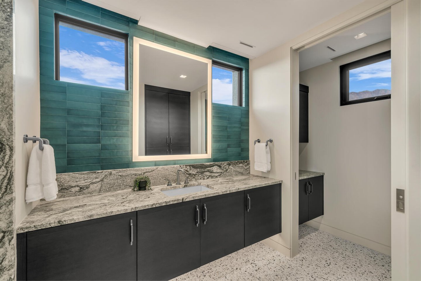 Im Herzen der Residenz befindet sich das durchdacht gestaltete Wohnzimmer – vorgestellt im Architectural Digest – mit einer markanten gefliesten Kaminwand, die von der umliegenden Wüstenlandschaft inspiriert ist. Reiche Texturen und eine nuancierte grüne Glasur spiegeln die Töne der Klippen und Vegetation jenseits der weitläufigen Fensterwand wider und schaffen einen dramatischen Fokuspunkt, der die Schönheit der Wüste direkt ins Innere bringt.
