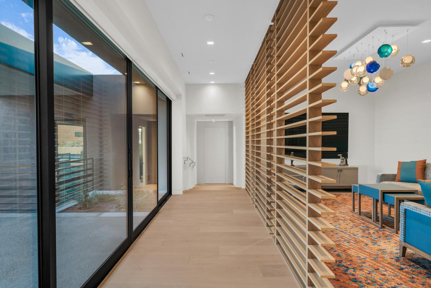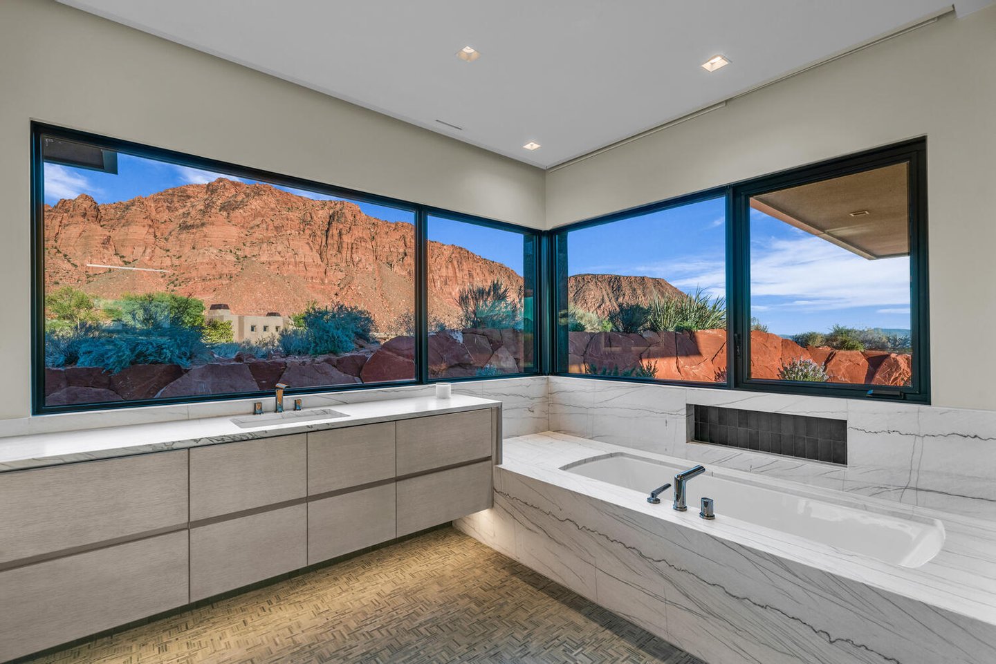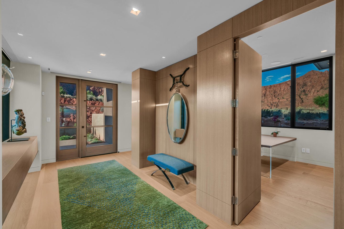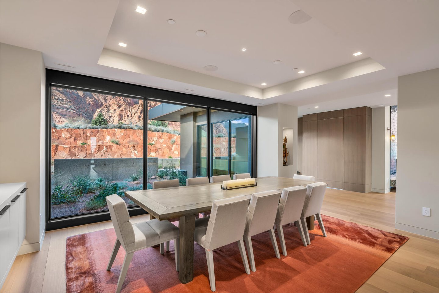 Weite Glaswände rahmen die sich ständig verändernden Farben des Wüstenhimmels und der Sandsteinklippen ein und verwischen die Grenze zwischen drinnen und draußen. Saubere architektonische Linien, organische Materialien und eine zurückhaltende natürliche Farbpalette schaffen Innenräume, die ruhig, geerdet und still elegant wirken.