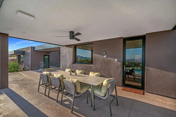 Das Leben im Freien ist ebenso verlockend. Weitläufige Terrassen, ein funkelnder Pool mit integriertem Whirlpool und ein dramatisches Feuerelement schaffen einladende Räume zum Zusammenkommen, Unterhalten oder einfach zum Entspannen unter dem weiten Wüstenhimmel. Ob Sie ein ruhiges Morgenbad genießen oder Freunde empfangen, während die Wüstenlandschaft sich durch die Sonnenuntergangsfarben wechselt – die Umgebung bietet ein seltenes Gefühl von Ruhe und Verbundenheit mit der Natur.