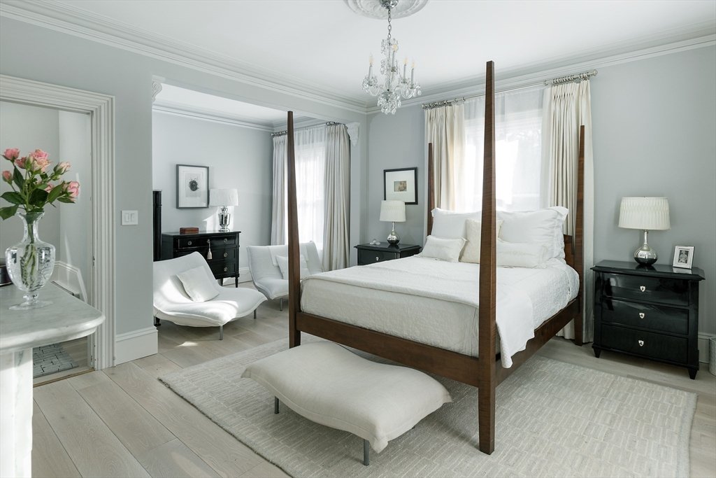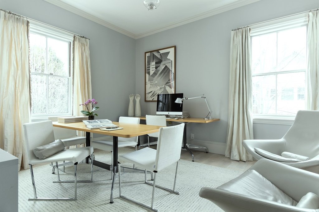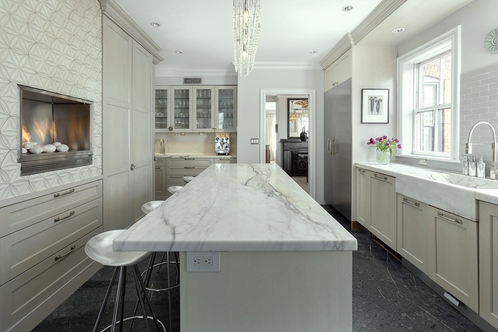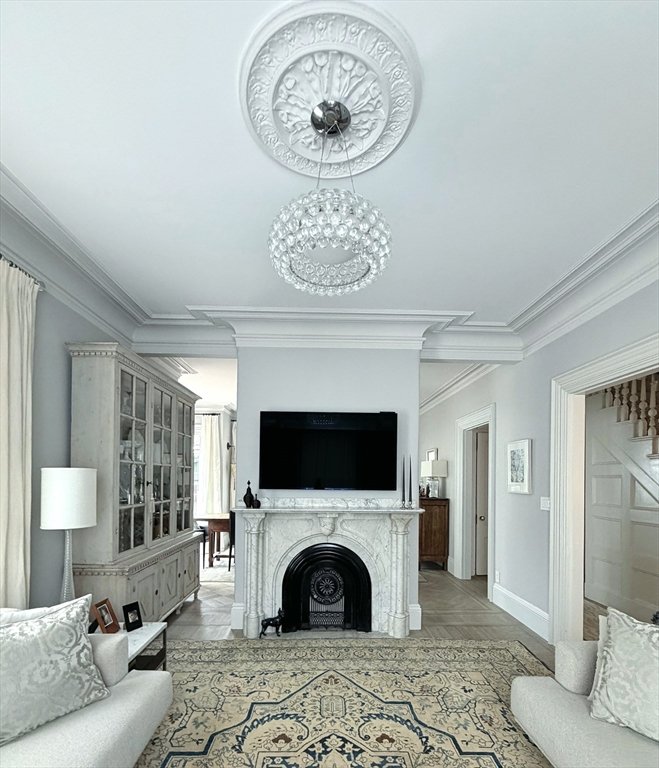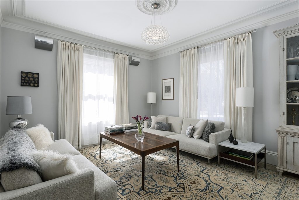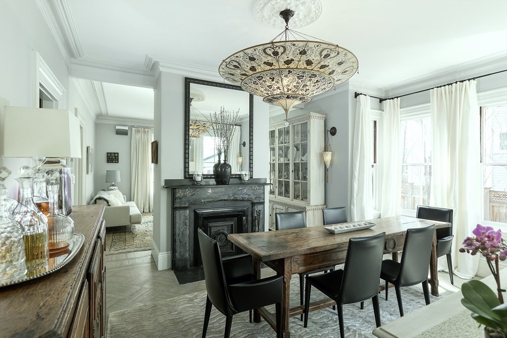Second Empire gem, circa 1875, in the heart of Brookline Village. Iconic french mansard roof, intricate brick coursework, monumental Hornbeam hedge, lovely rose gardens and three bricked outdoor living spaces adorn this stately home. Listed on the National Register of Historic Places. Soaring ceilings, generous light, resplendent plasterwork and mouldings, horsehair plaster and wavy glass windows throughout. Parlor complete with B&O TV opens to formal diningroom showcasing back-to-back original marble fireplaces. A designer renovation preserved original architectural details while adding modern, luxury conveniences including: all new systems, upgraded electrical, plumbing, HVAC, roofs, gutters. Chef's kitchen has LaCornue/Meile appliances, fine marble countertops/sink and heated slab floors with an espresso/wet bar. The primary en suite features custom wardrobes, tub room and laundry. Bathrooms are Italian marble. Bonus 1000 sqft basement can add living space, in-law suite or ADU.