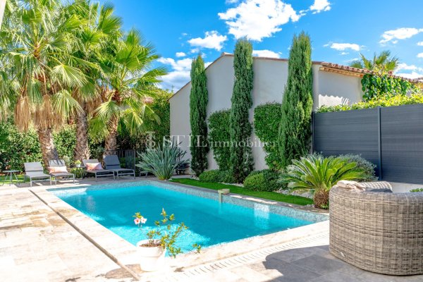 Verkauf Villa Sainte-Maxime. In einer ruhigen Wohngegend, charmante neue Villa von ca. 129 qm Wohnfläche auf einem Grundstück von ca. 606 qm gebaut, Eingang, großer Wohnkamin mit Zugang zur Terrasse, Einbauküche, 3 Schlafzimmer, 2 Bäder mit separatem WC. Ein Überlaufpool schmückt den schön erhöhten Garten. ermäßigte Gebühren