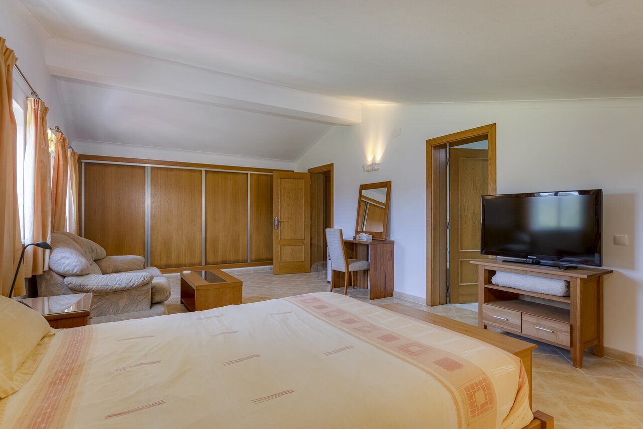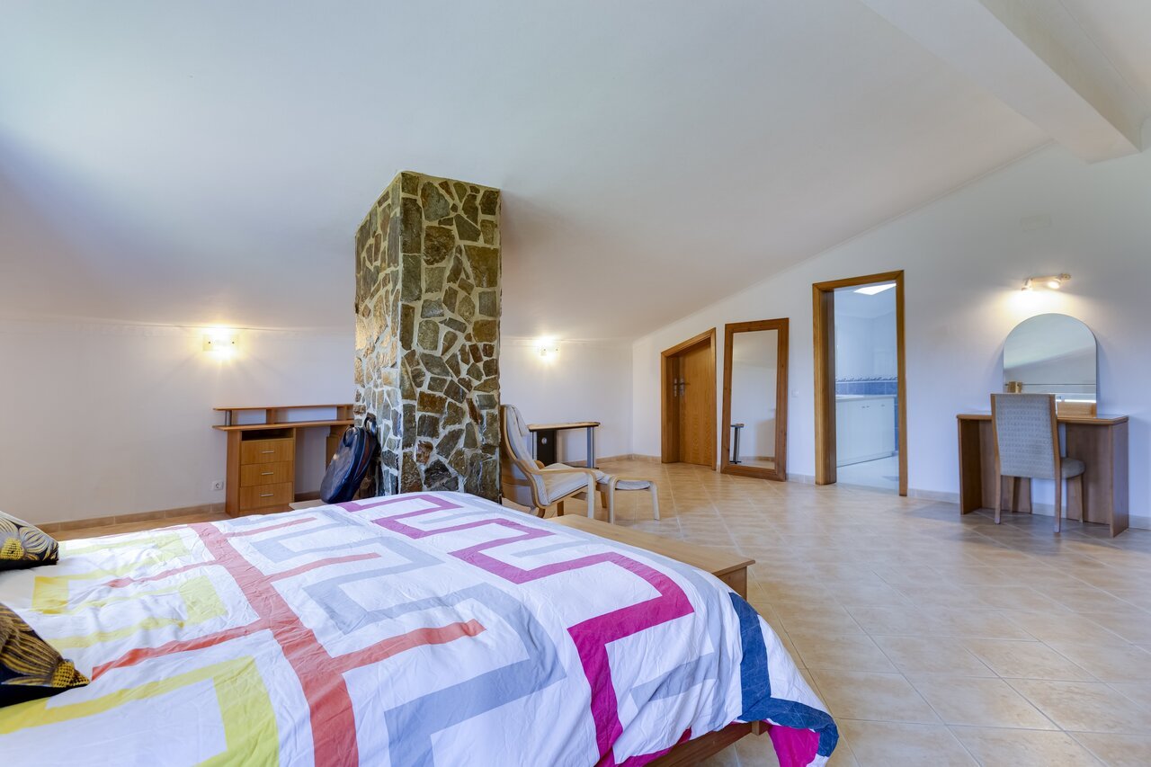 The property features four bedrooms and four bathrooms (three en suite), a fully furnished interior and a fully equipped modern kitchen. The living room includes air conditioning and a wood-burning fireplace with a heat distribution system that heats the bedrooms, while the master bedroom also has air conditioning.