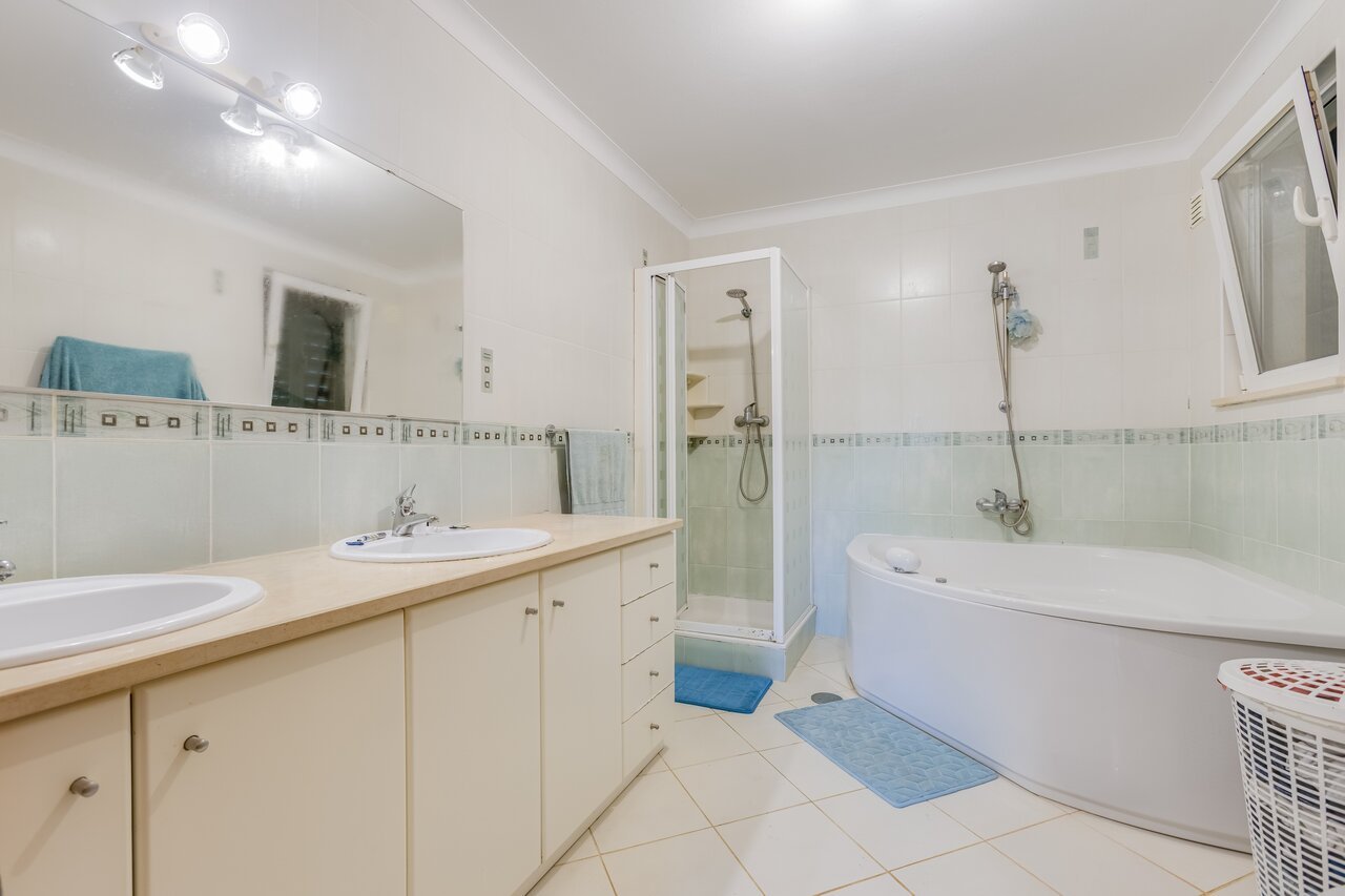 On the upper floor there are two large bedrooms with custom-made built-in wardrobes, a fully equipped gym (included in the sale) and a connecting hallway with storage. A games room in the basement and additional storage space offer even more versatility.